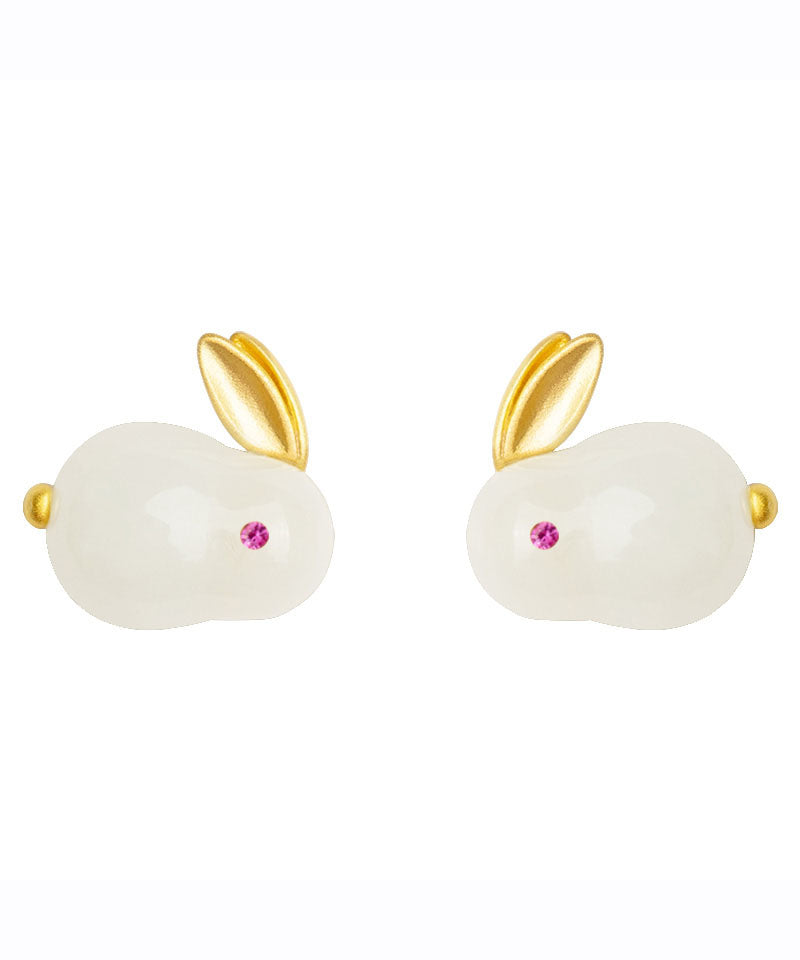 Art White Sterling Silber Overgilt Jade Kaninchen Ohrstecker