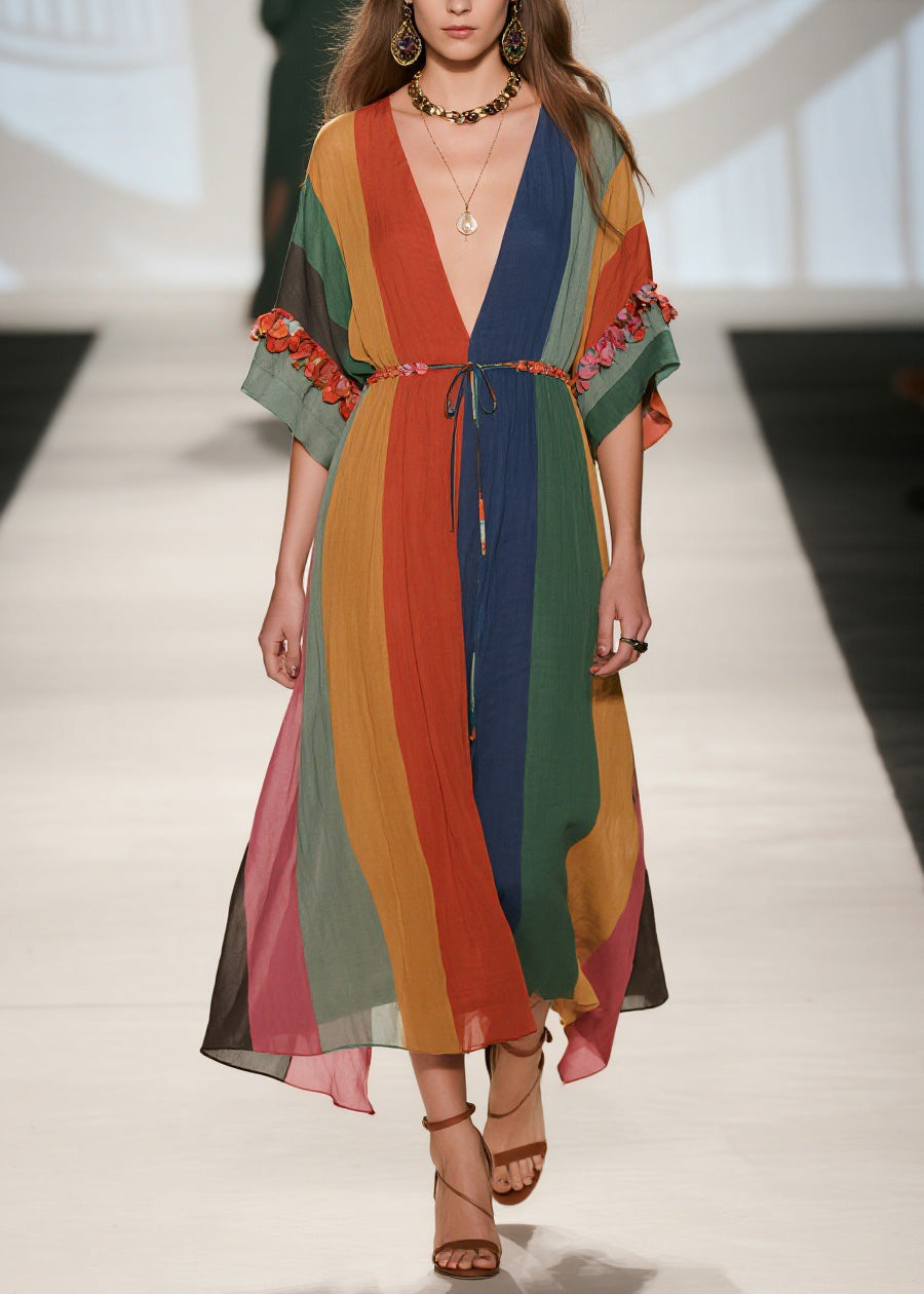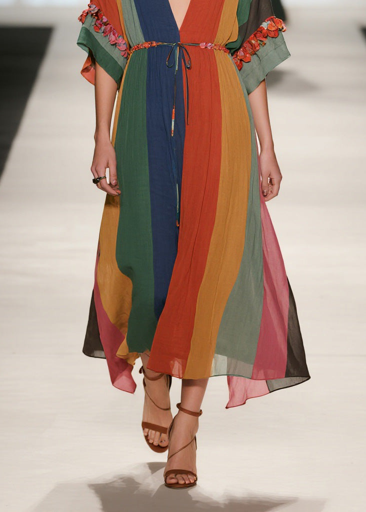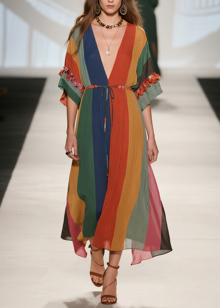 Beautiful V Neck Floral Patchwork Lace Up Cotton Dresses Summer