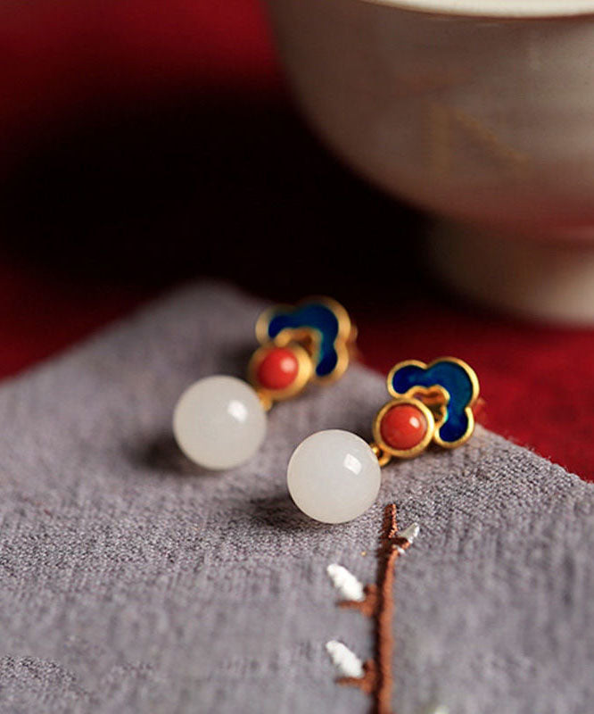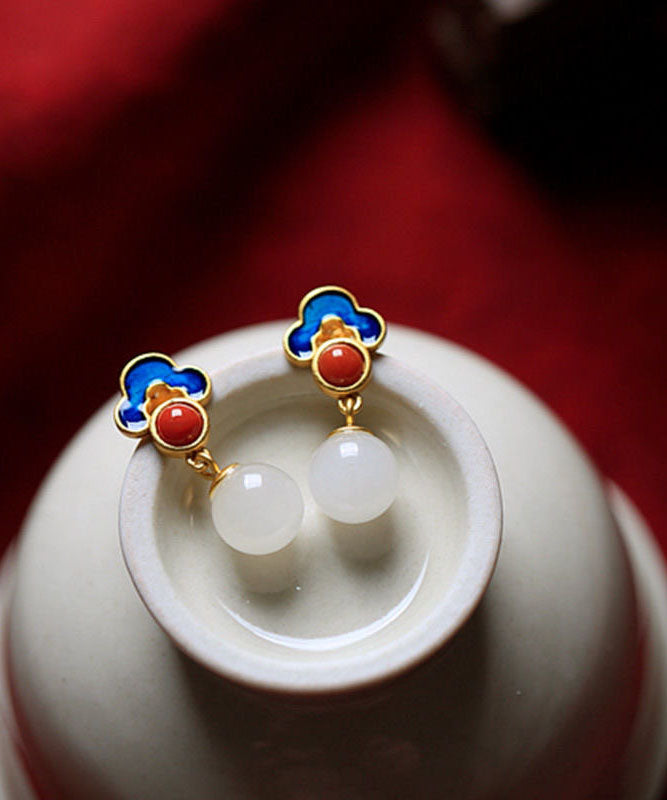 Wunderschöne weiße Sterling Silber Overgild Jade Achat Emaille Glücksbringer Wolke Tropfen Ohrringe