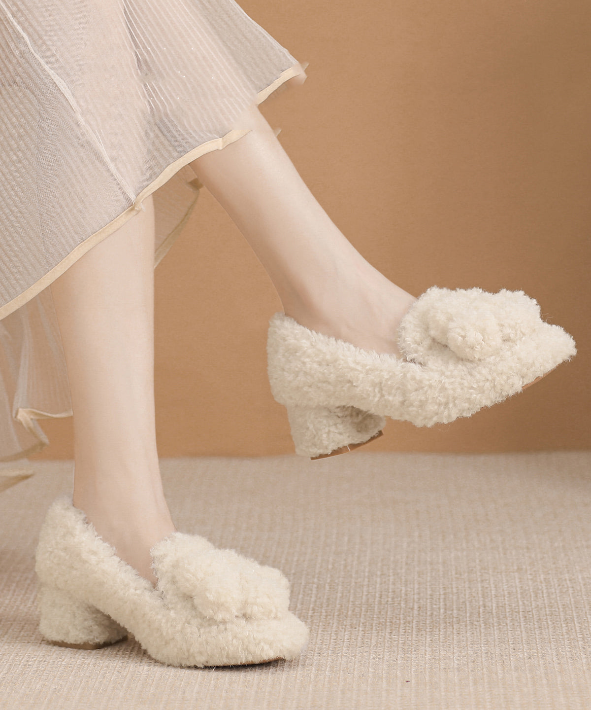 Beigefarbene, schicke High Heels aus Kunstpelz mit klobigen Absätzen und flauschigem Wollfutter