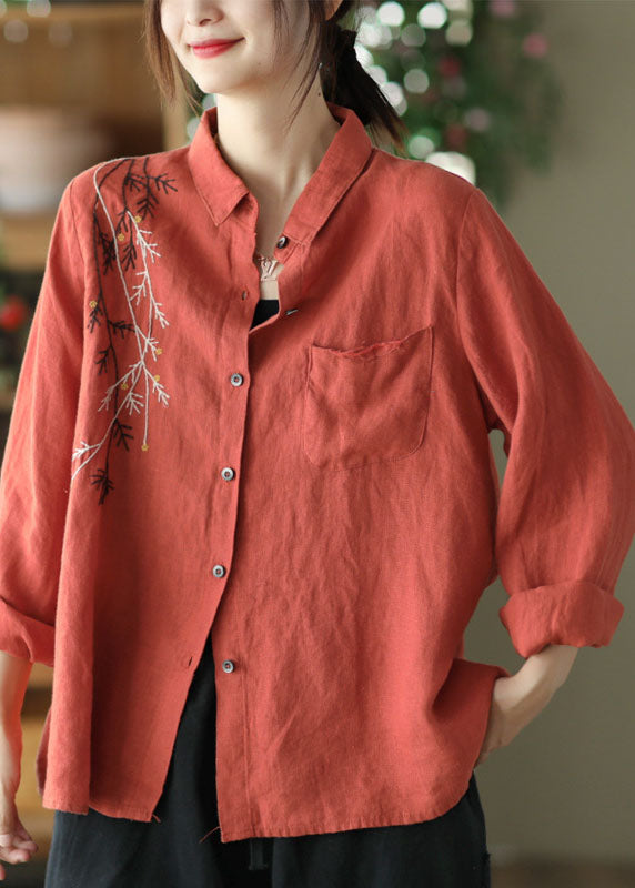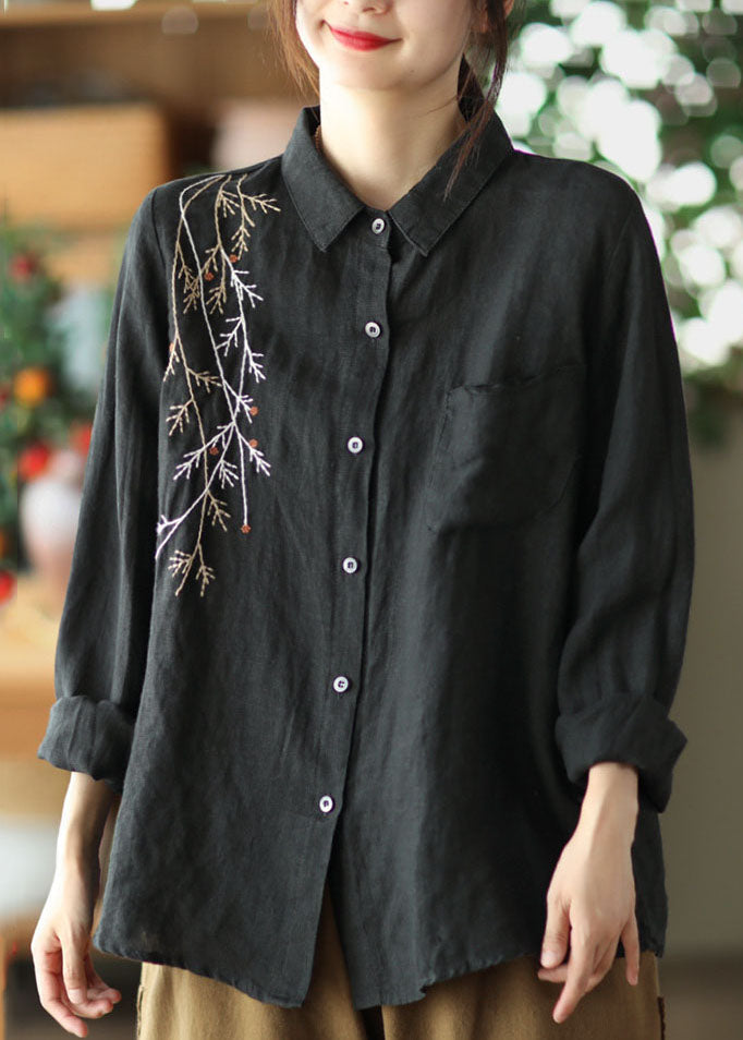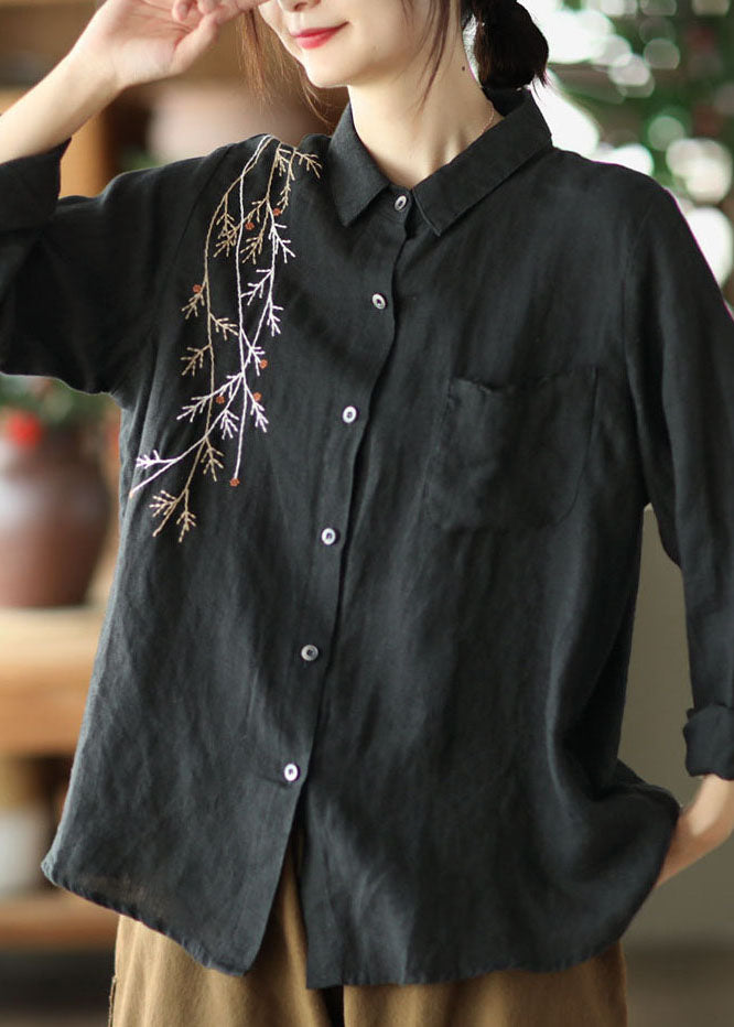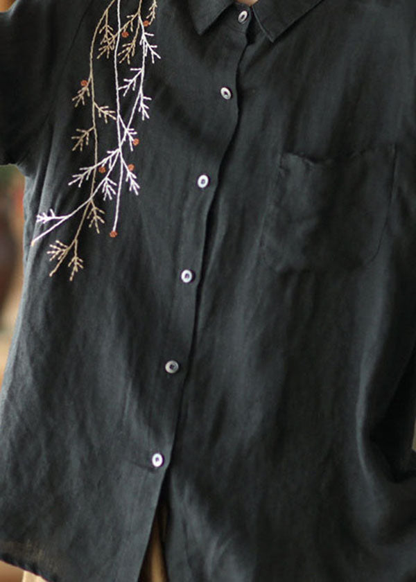 Schwarzes Patchwork Leinenhemd Top Bestickter Knopf Frühling