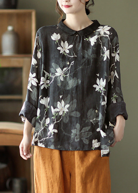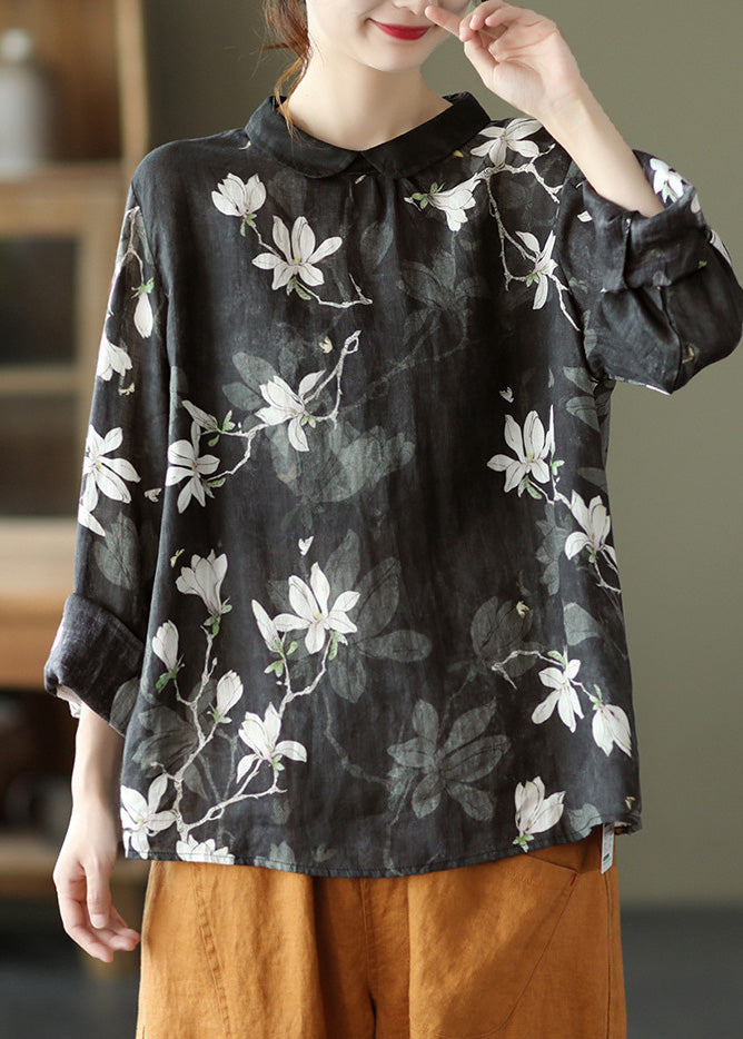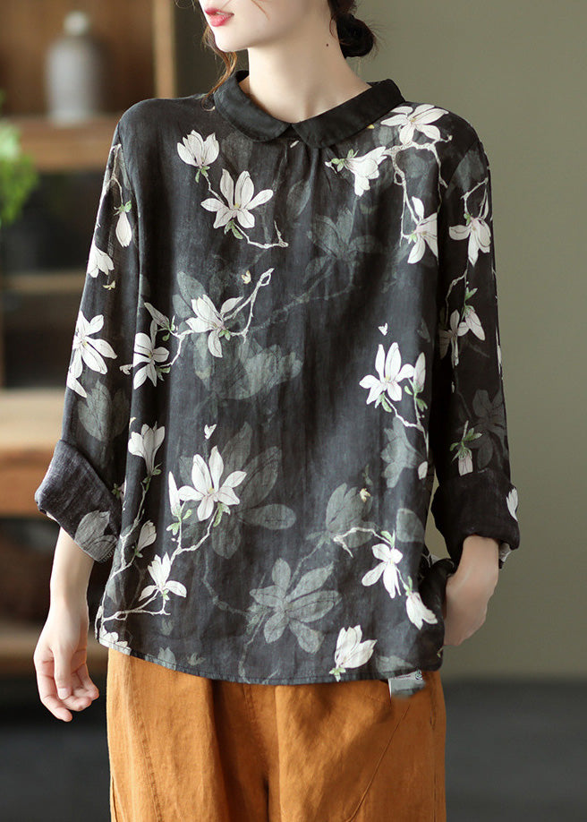 Schwarzes, bedrucktes, gemütliches Ramie-Oberteil mit langen Ärmeln