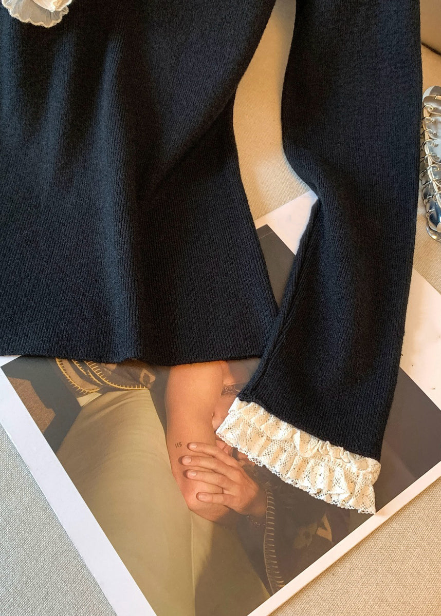 Schwarzes, gerüschtes Patchwork-T-Shirt aus Strickbaumwolle mit V-Ausschnitt für den Herbst