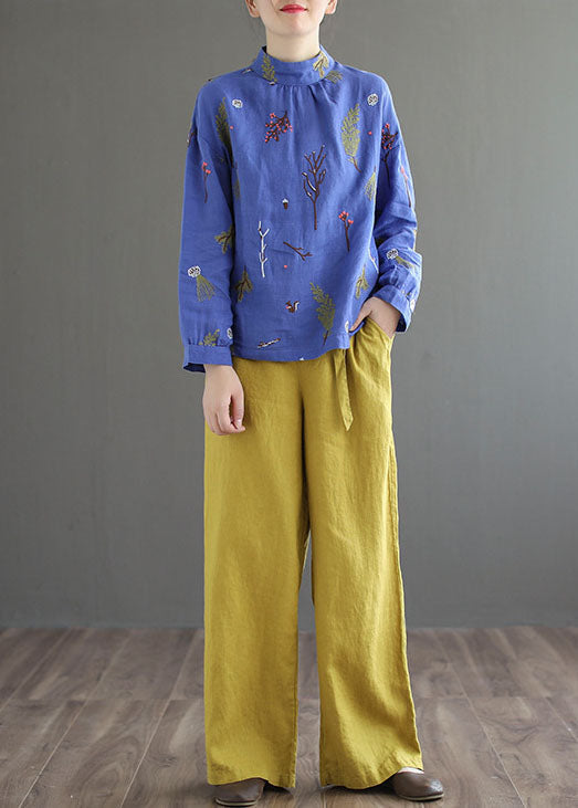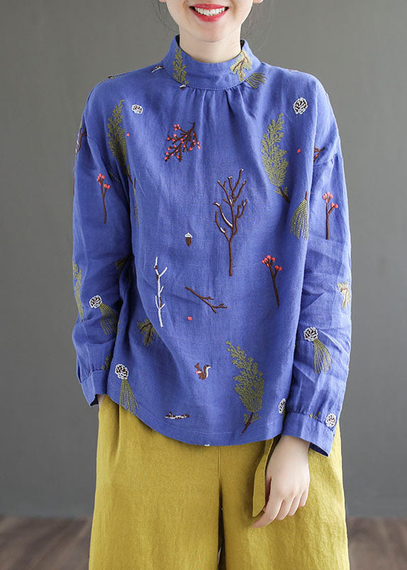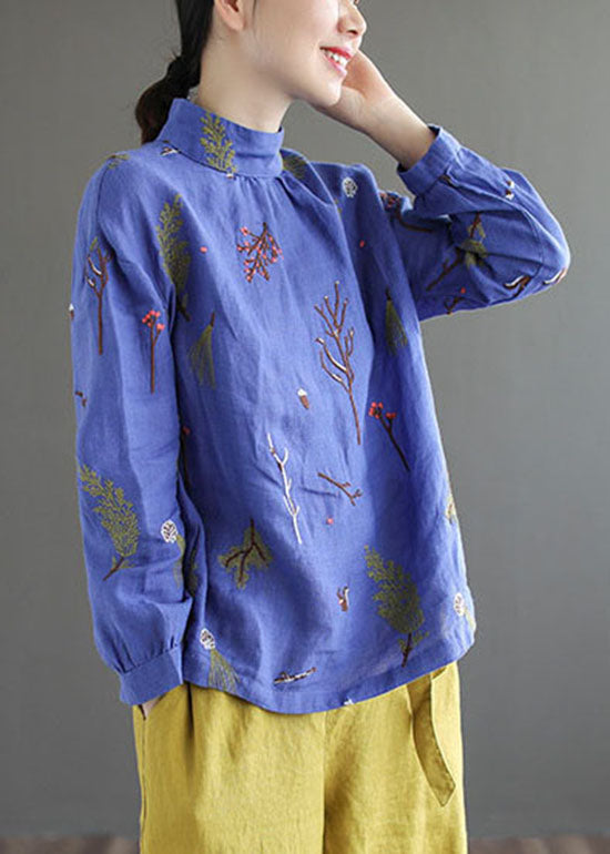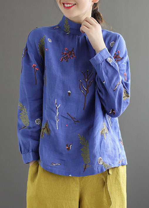 Blaues Patchwork-Leinenhemd Tops Bestickter Stehkragen Langarm