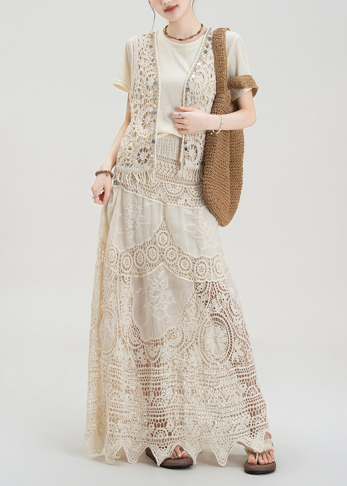Sommerliches Set aus Weste, Rock und Rock mit aprikosenfarbenem Lochmuster und Blumenmuster