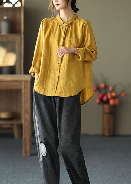 Boho Gelb Peter Pan Kragen Patchwork Leinen Shirts Top Langarm