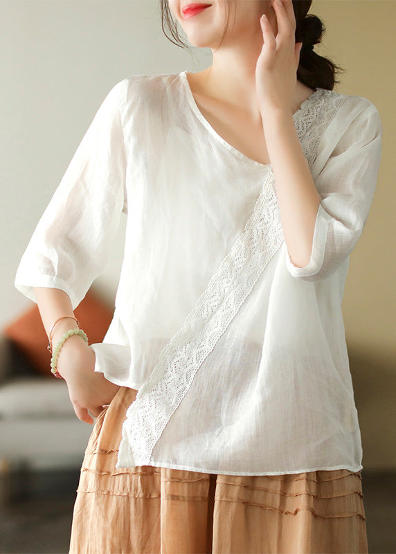Kurzes Mulberry V-Ausschnitt bestickte Spitze Patchwork solide Leinen Top Kurzarm