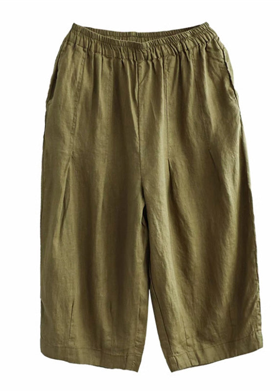 Lässige Armeegrüne Taschen Elastische Taille Gemütliche Leinenhose mit weitem Bein
