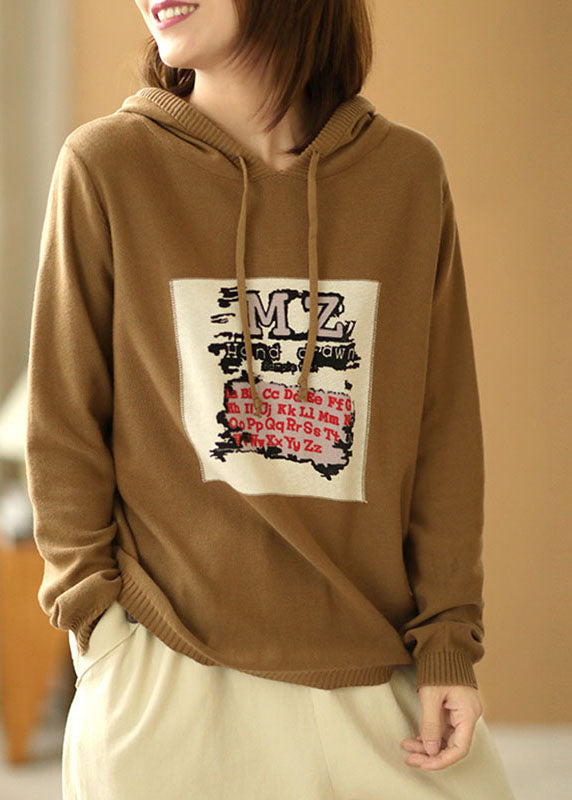Lässiger Khaki-Strickpullover mit Kapuze und Kordelzug