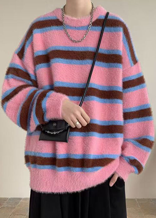 Casual Pink Striped Cozy Ma Hai Mao Mens Sweaters Winter