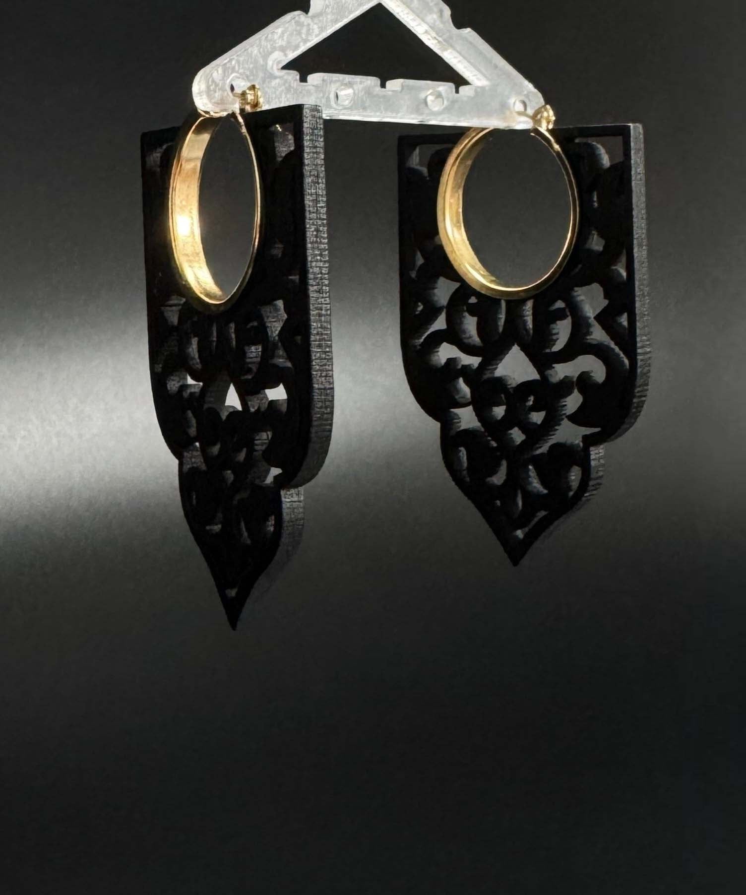 Elegante schwarze Creolen aus Holz mit durchbrochener Optik