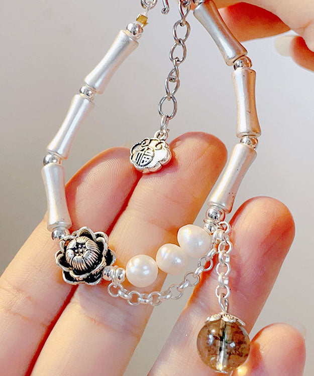 Schickes Seidenarmband aus Sterlingsilber mit Perlen und Kristallen und Blumenmuster und Bambus-Charm