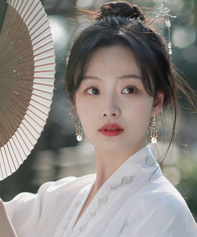 Schicke weiße antike Gold Jade Ping Schnalle Vögel Blumen Tropfen Ohrringe