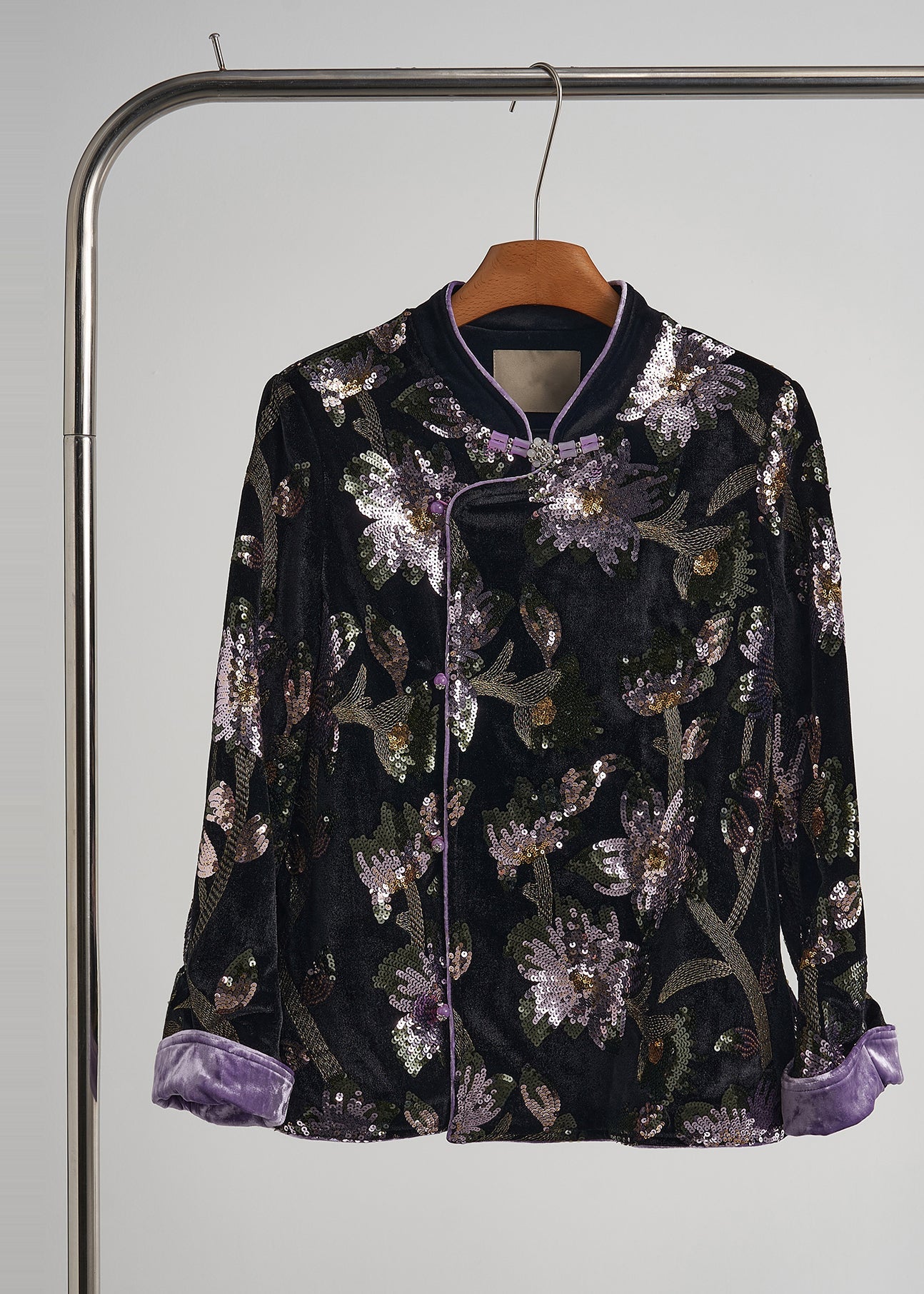 Schwarze, paillettenbestickte Seidensamtmäntel im chinesischen Stil – Frühling