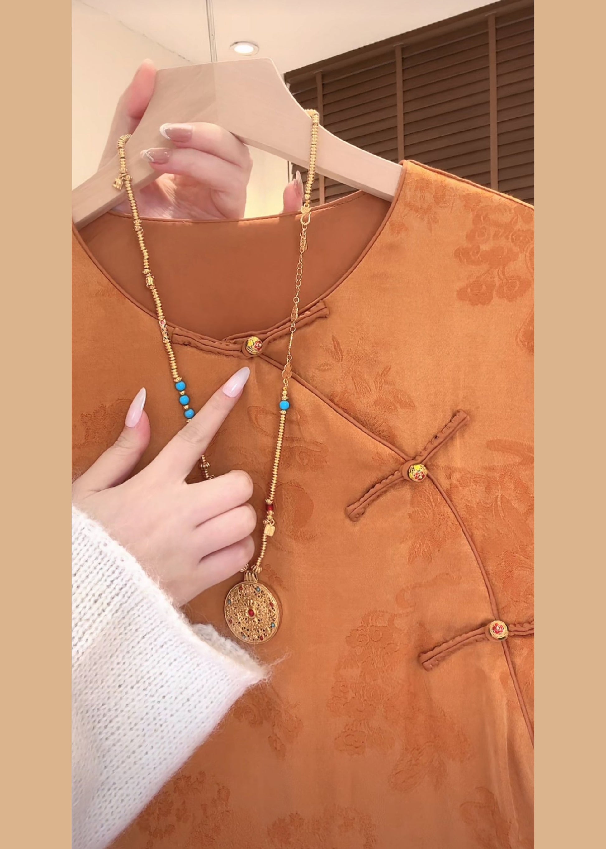 Chinese Style Orange O-Neck Mink Hair Patchwork Shirt Fall