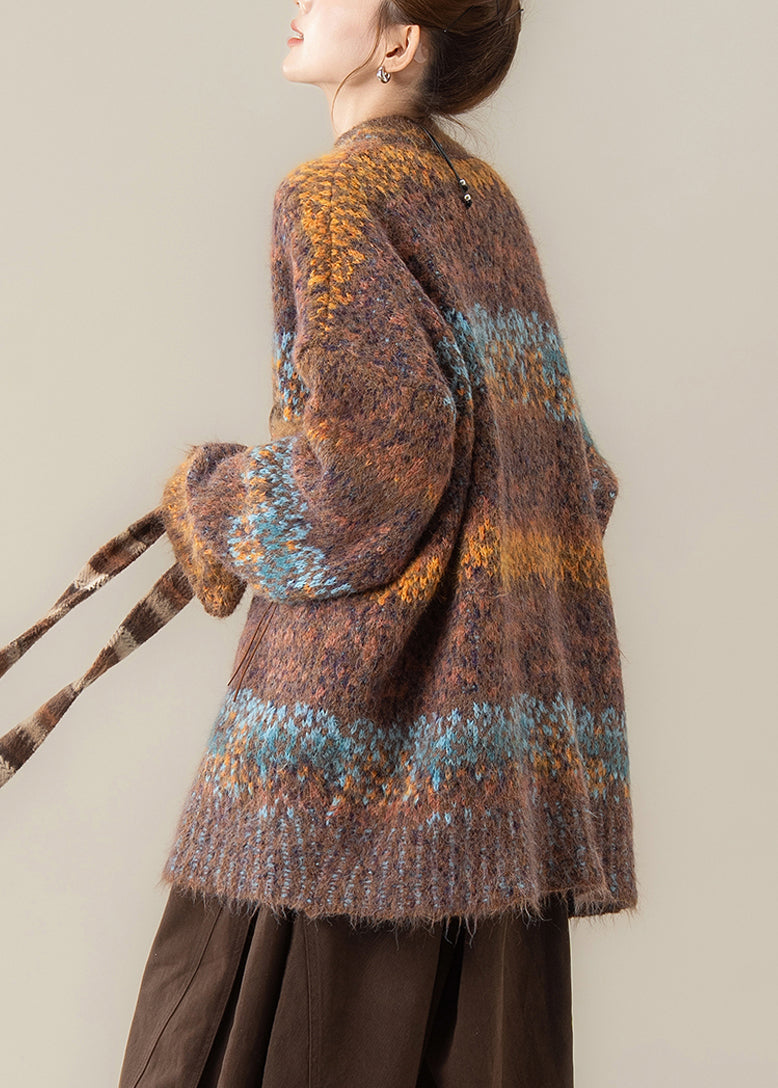 Kaffeefarbener, gestreifter, kuscheliger Patchwork-Strickmantel mit Knopfleiste und V-Ausschnitt