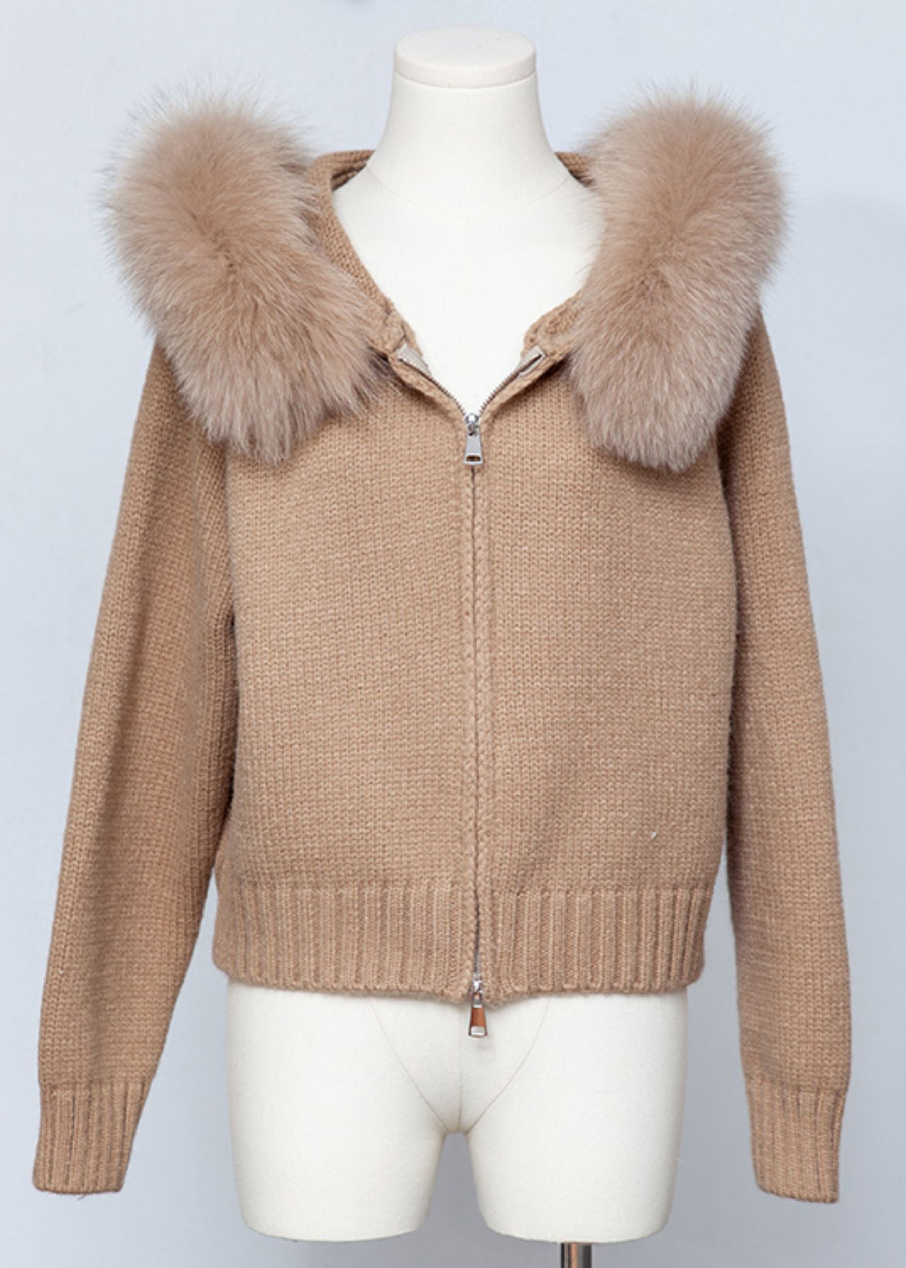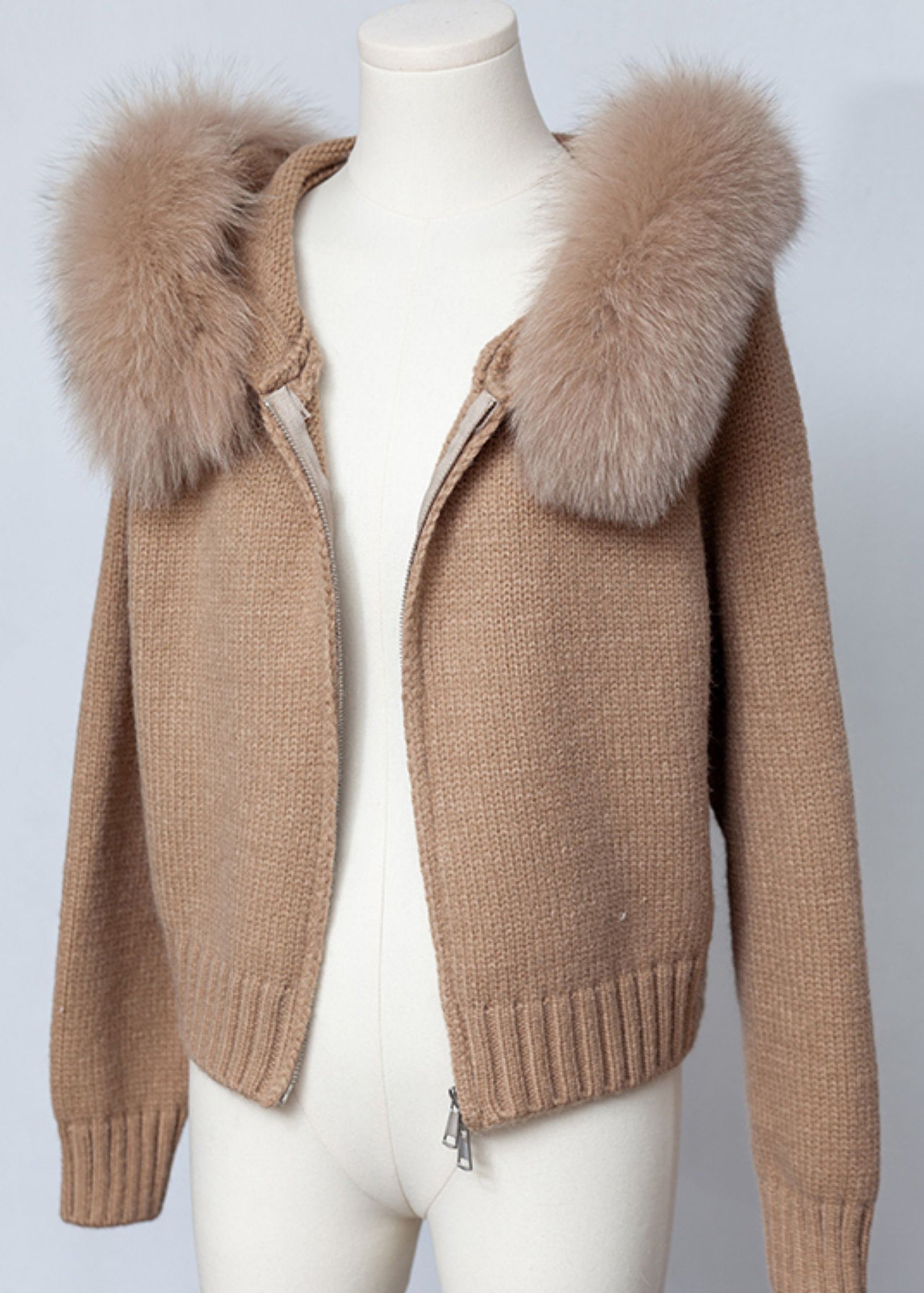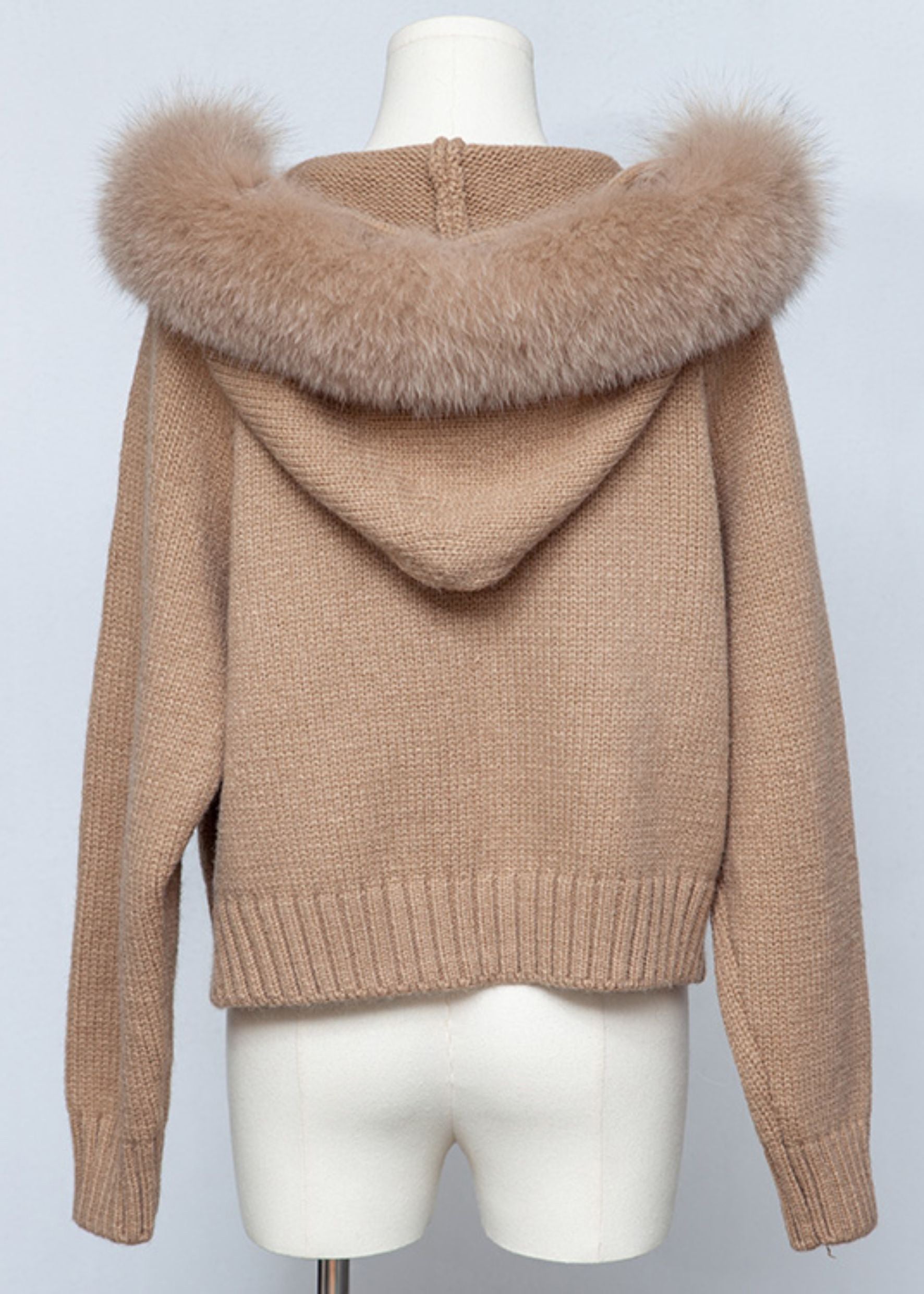 Kaffeebraune, einfarbige Strick-Frühlingsmäntel mit Kapuze und Reißverschluss, Patchwork-Design