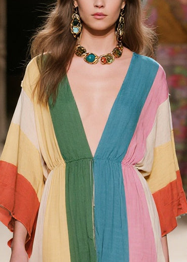 Colorblock Print Cotton Holiday Dress Deep-V Neck Summer