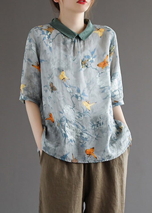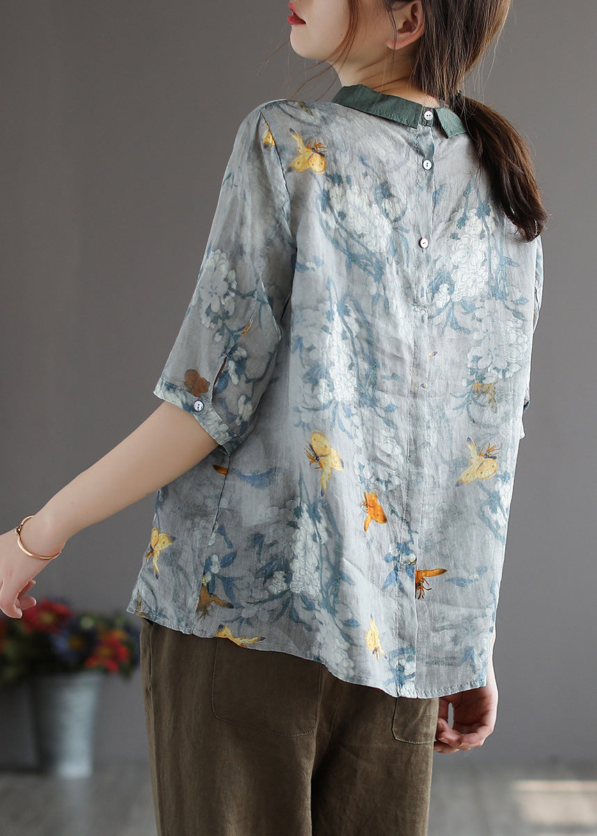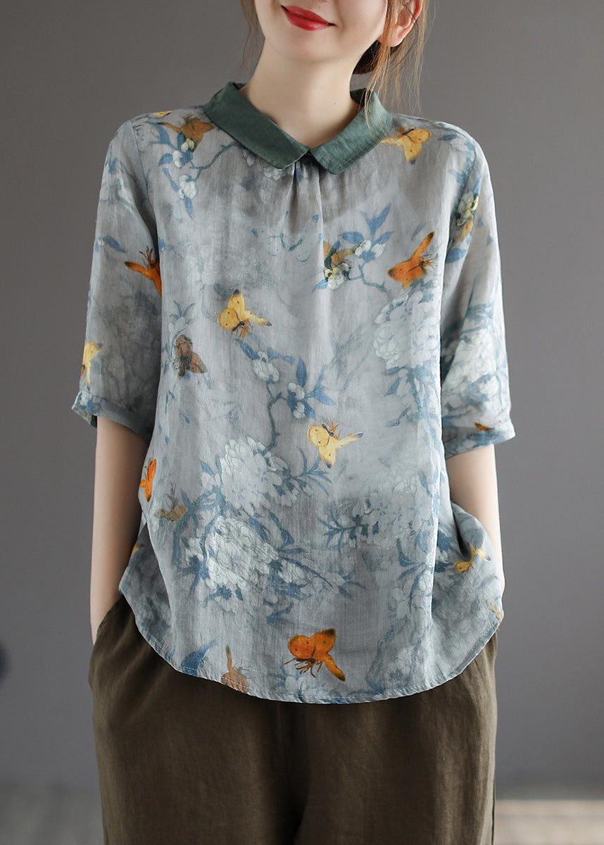 Dunkelgraues bedrucktes Leinenoberteil mit kurzen Ärmeln