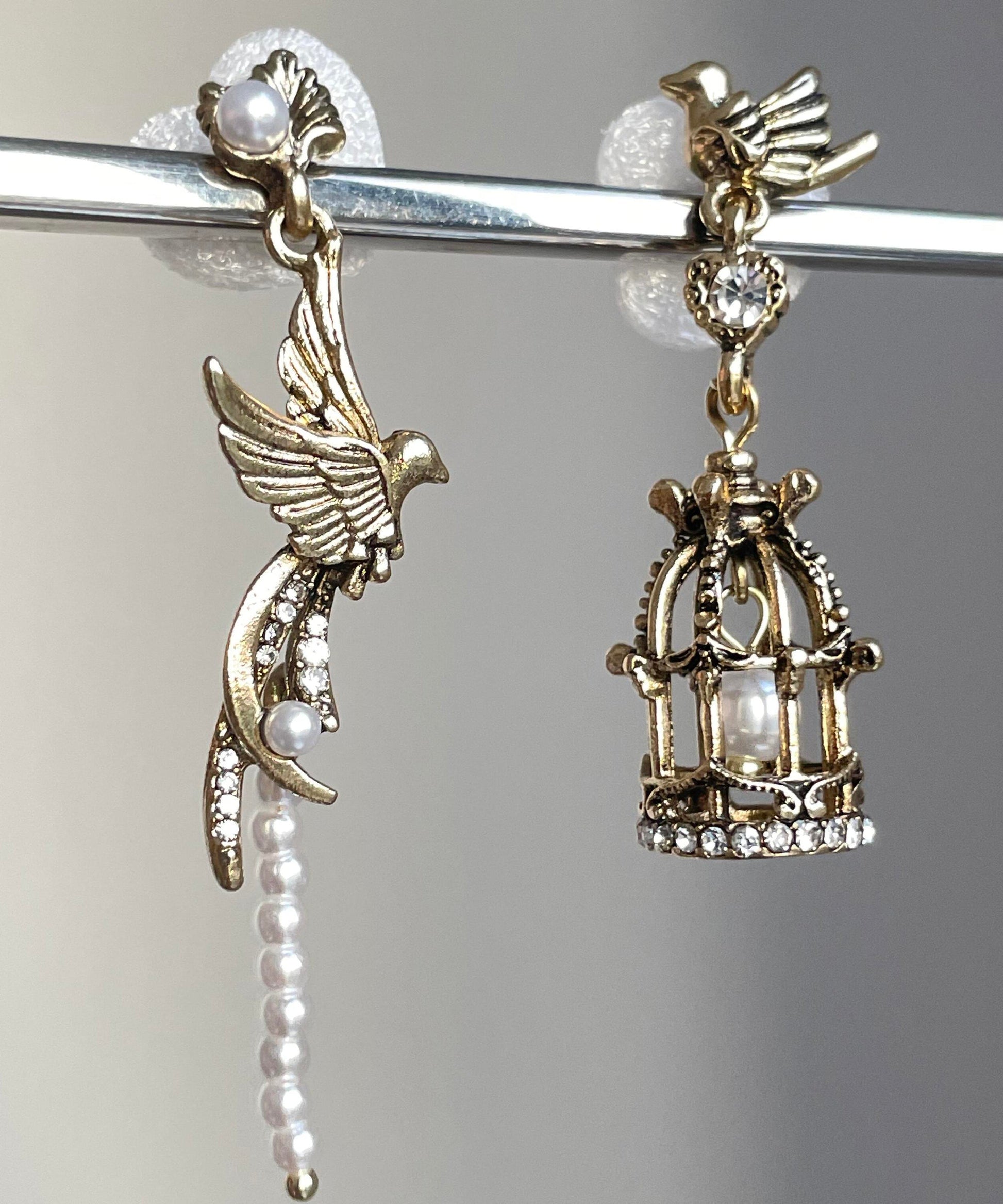 Fine Gold Alloy Asymmetrica Pearl Flying Bird Birdcage Tassel Drop Earrings
