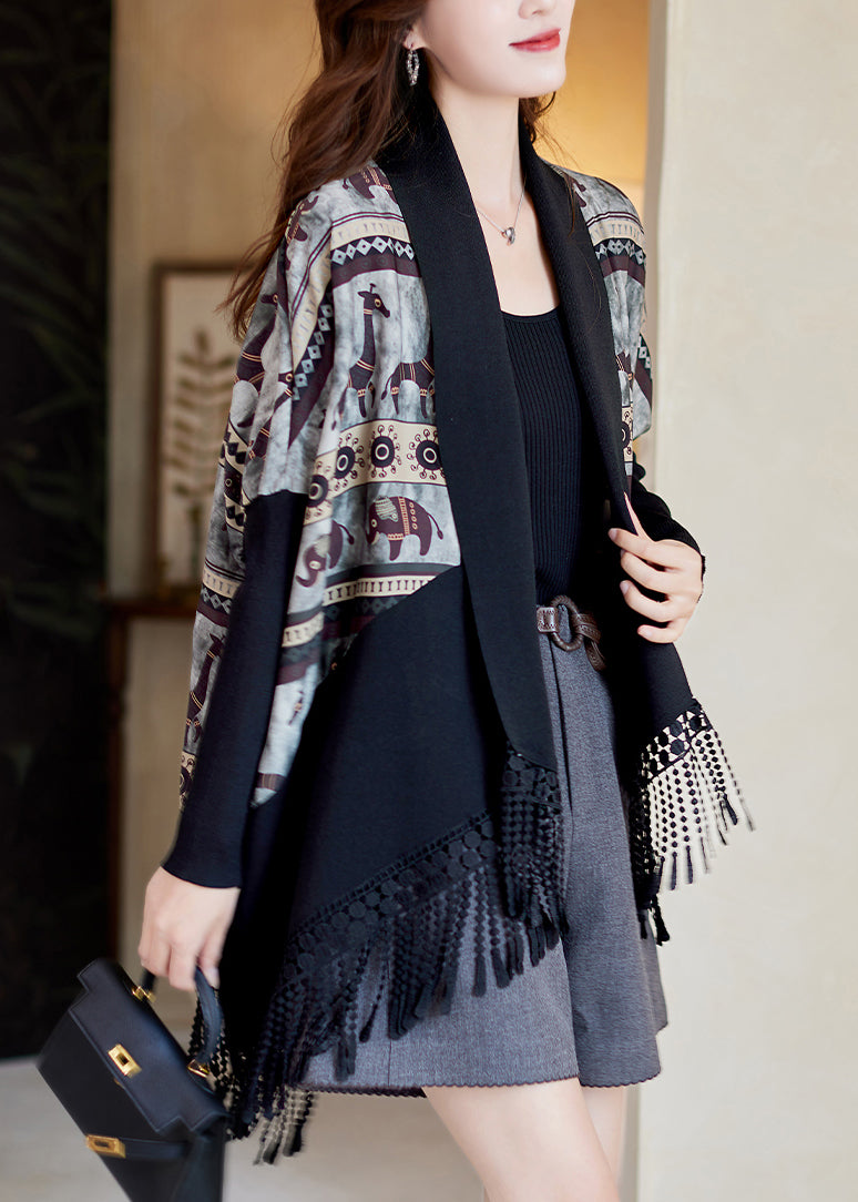 Fine Green Tasseled Print Patchwork Knit Cardigan Batwing Sleeve
