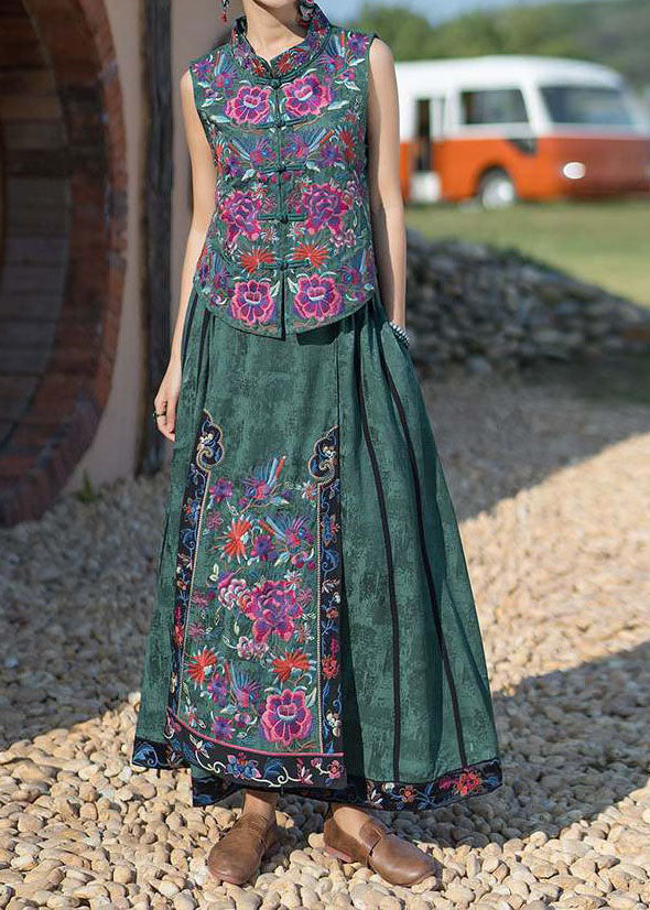 Feiner grüner, zerknitterter, bestickter Patchwork-Seidenrock mit Taschen für den Sommer