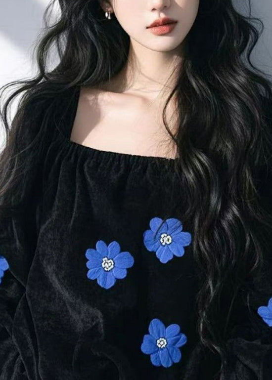 French Black Square Collar Floral Velour Shirt Top Fall