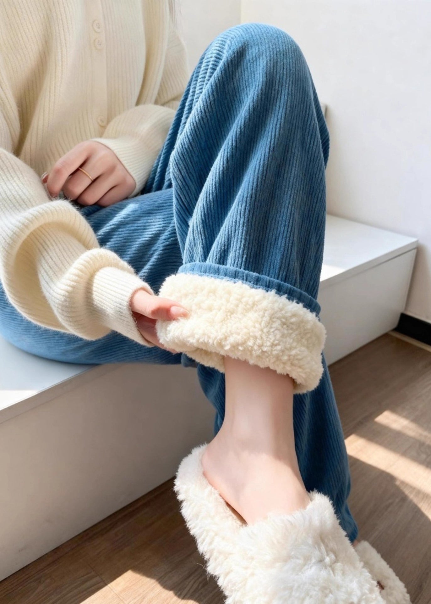 Französischblaue Patchwork-Cord-Fleecehose mit hohem Bund und weitem Bein für den Winter