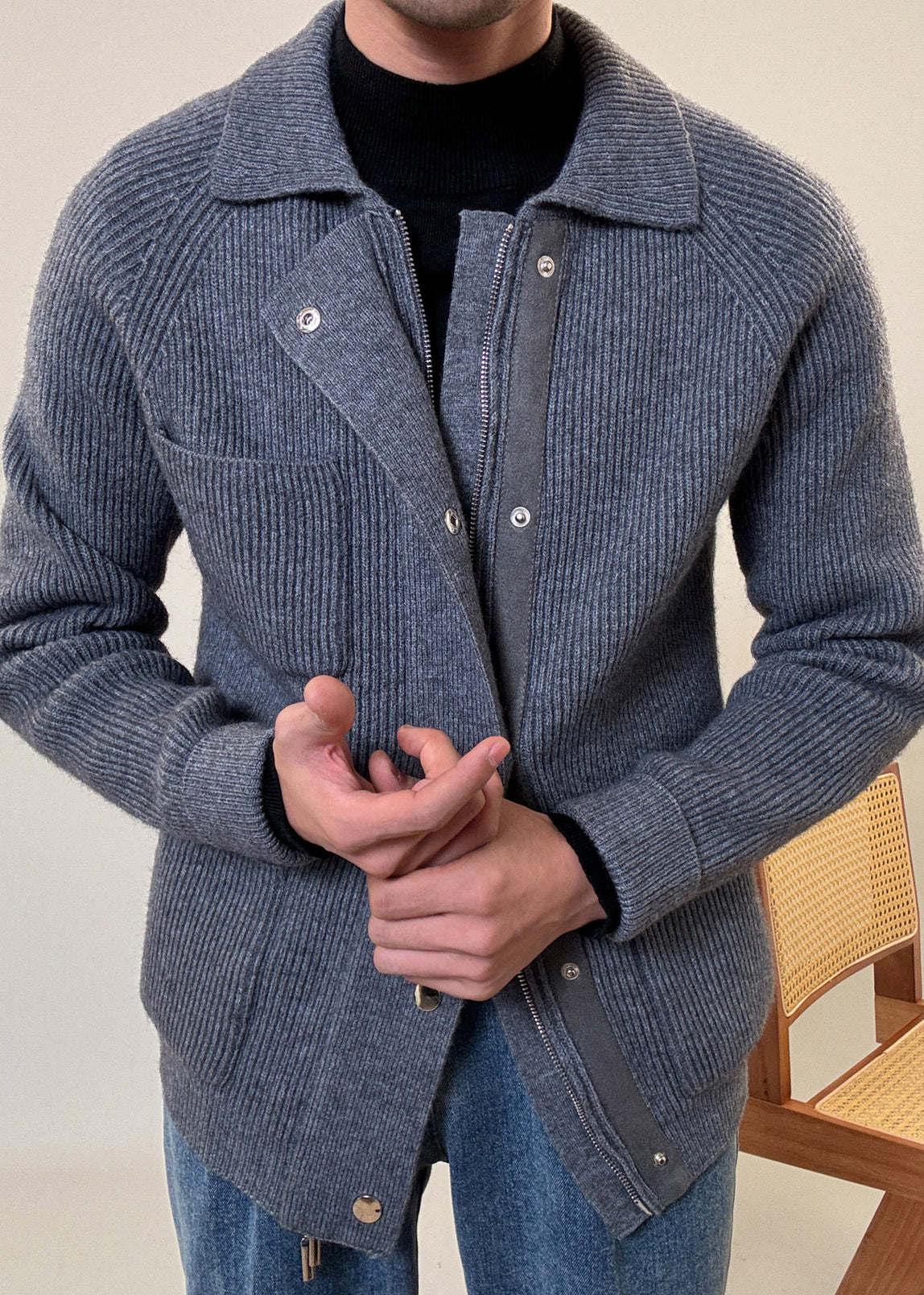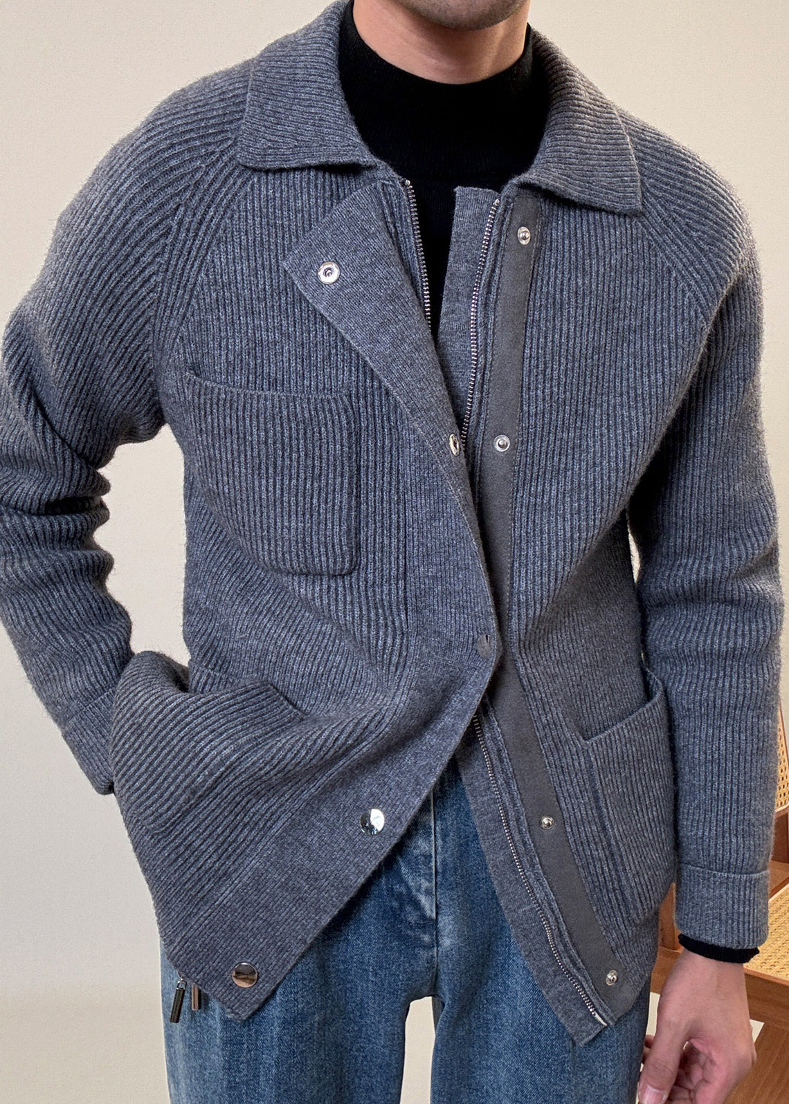 Grauer, kuscheliger Baumwollstrickmantel mit Knopftaschen und Reißverschluss für Herren (Frühling)
