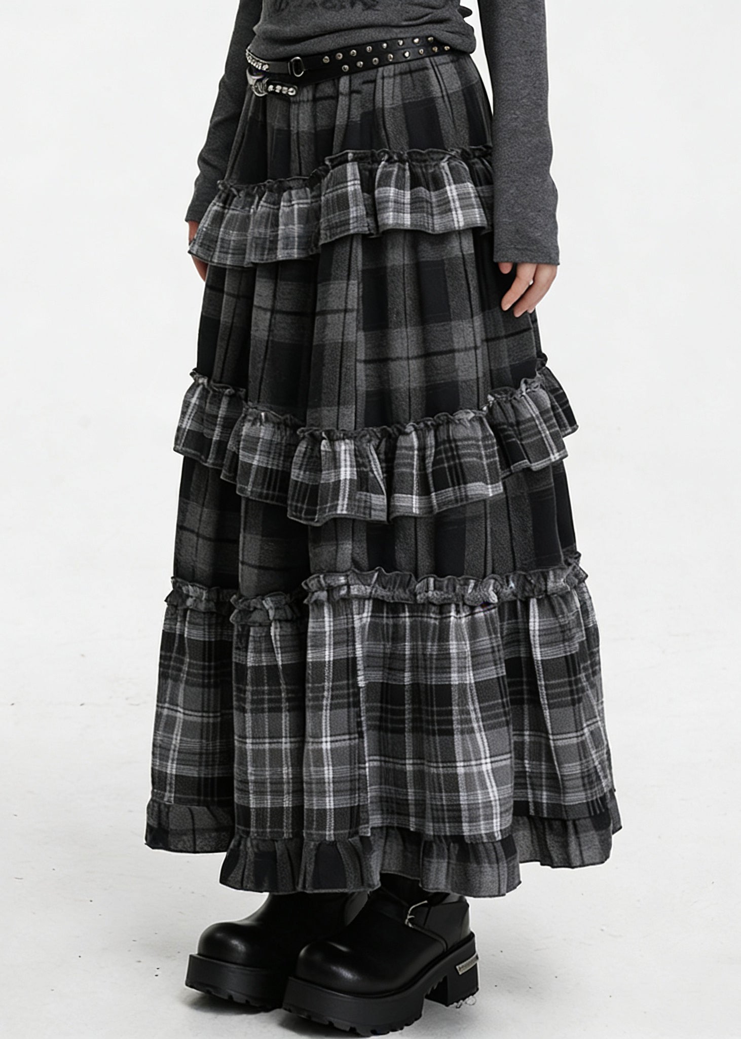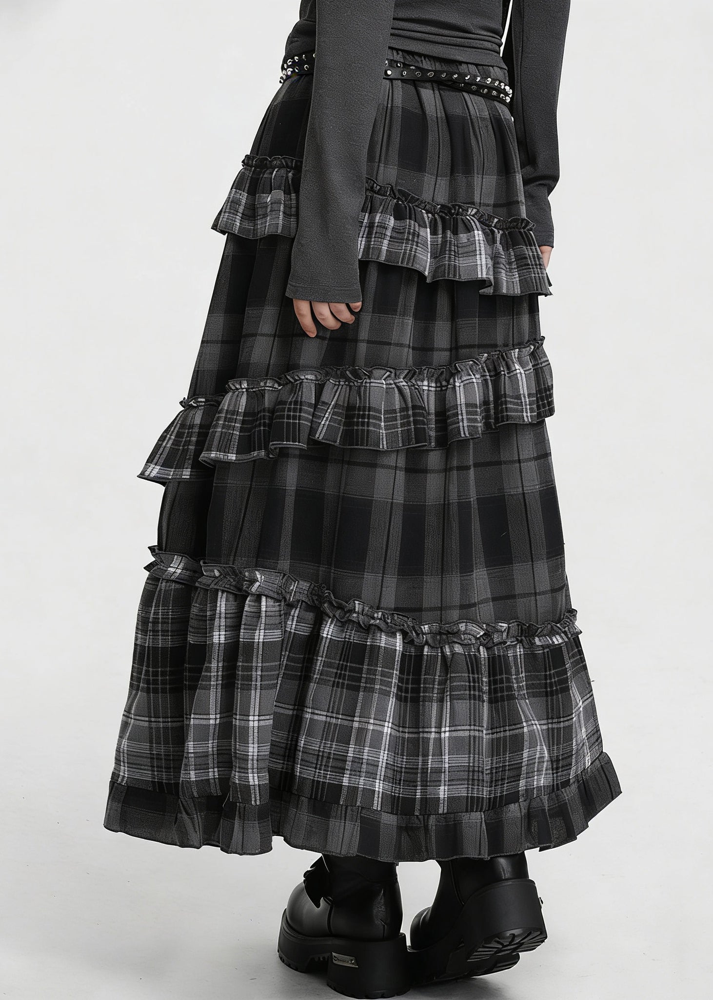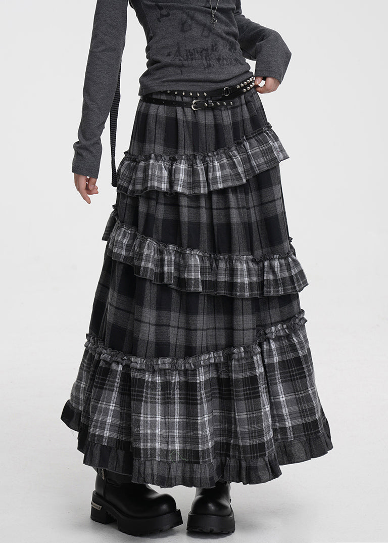 Grauer karierter Patchwork-Baumwollrock mit Rüschen und elastischem Bund