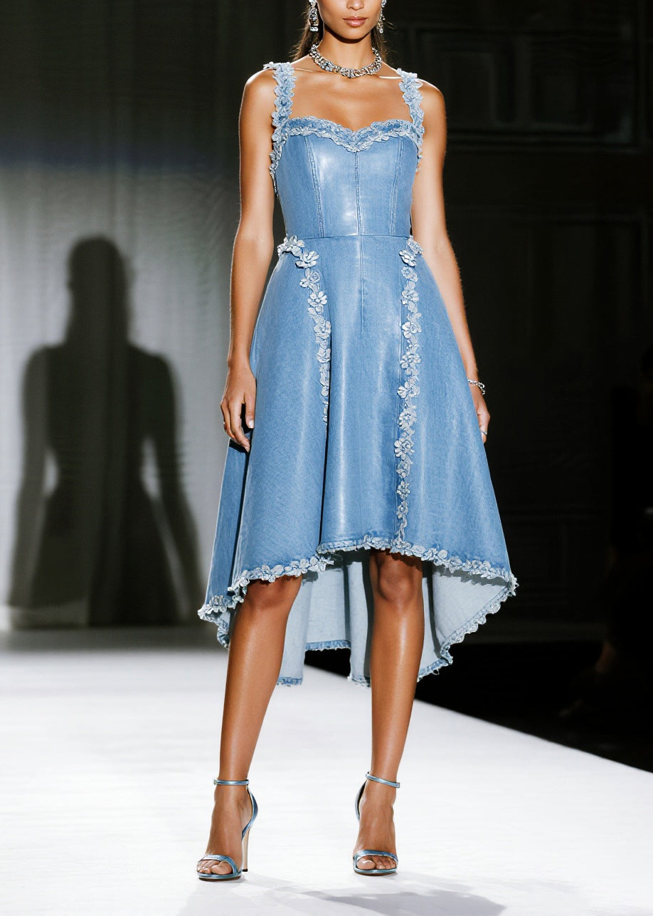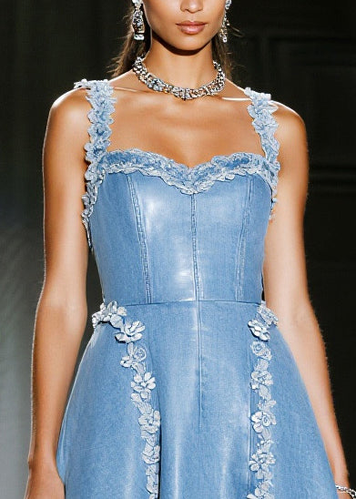 Handmade Blue Floral Decorated Exra Large Hem Denim Sundress Summer