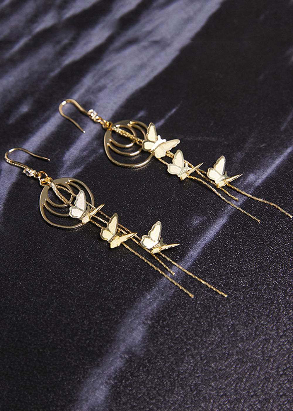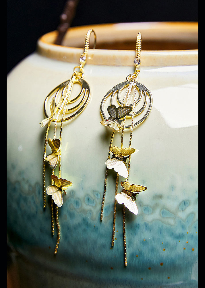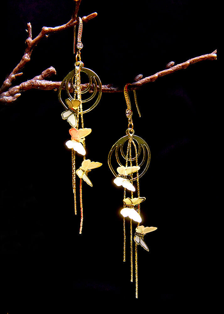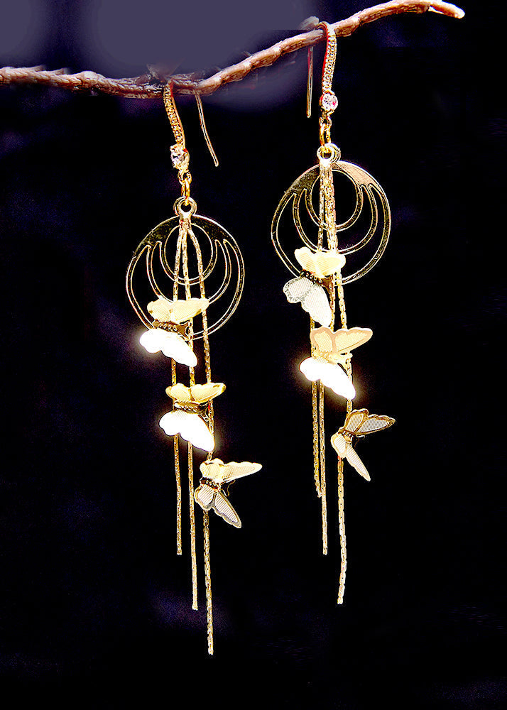 Handgefertigte Schmetterlings-Tropfenohrringe aus 14 Karat Gold mit Quasten
