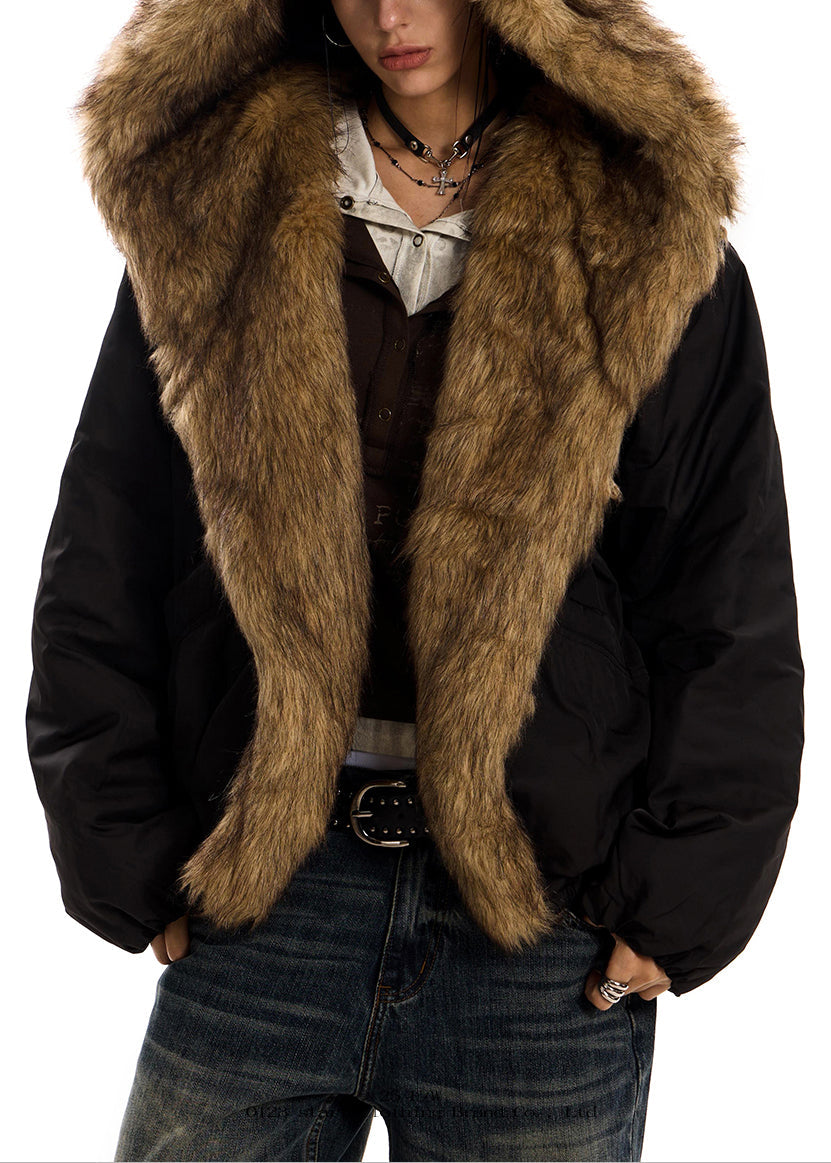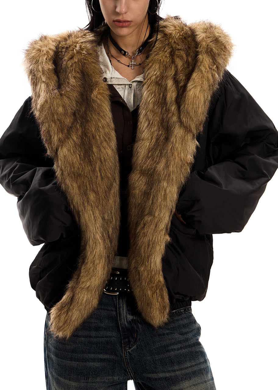 Italienischer schwarzer Kapuzenmantel mit Patchwork-Design, Kunstpelzfüllung und Baumwollfüllung, Winter