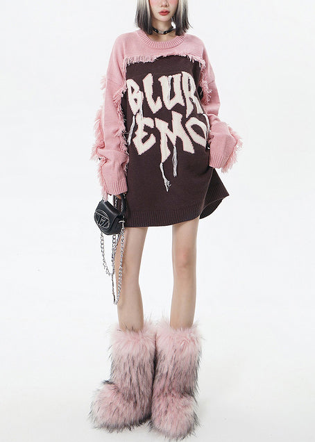Italienischer brauner, bestickter Patchwork-Pullover mit Quasten, lang, Winter