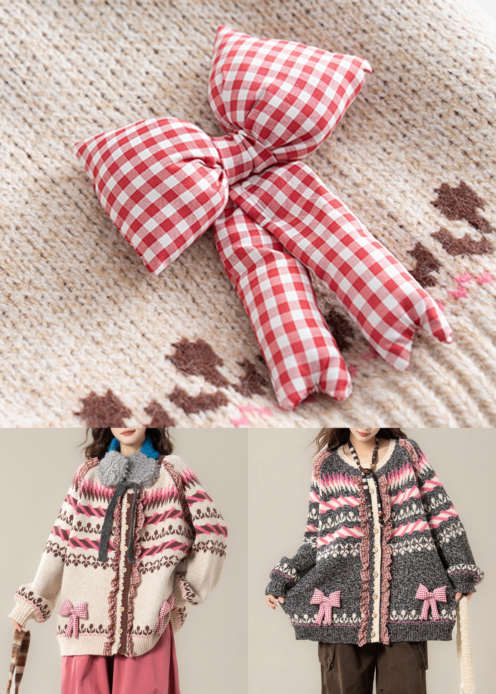 Jacquard-Strickmäntel in Dunkelgrau mit Rüschen und Schleifen-Patchwork für den Frühling
