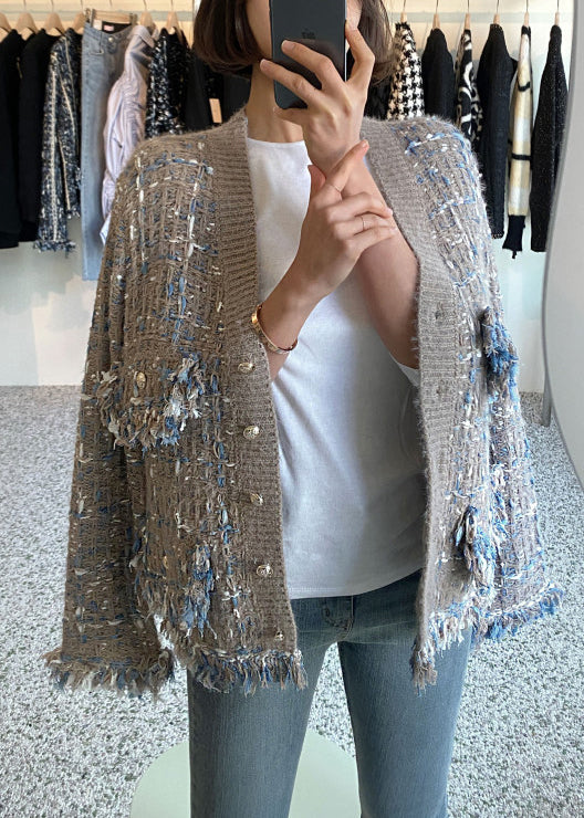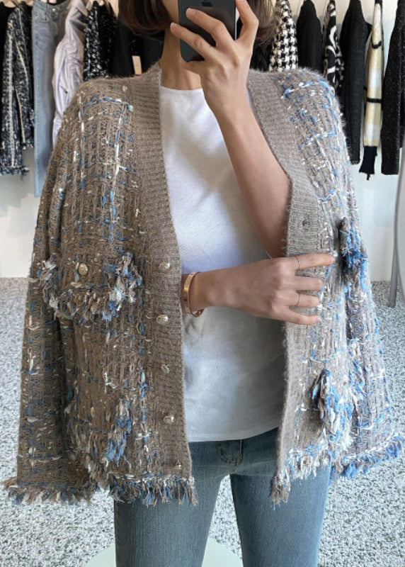 Khakifarbener Strickmantel aus Baumwolle mit V-Ausschnitt und Quastentaschen