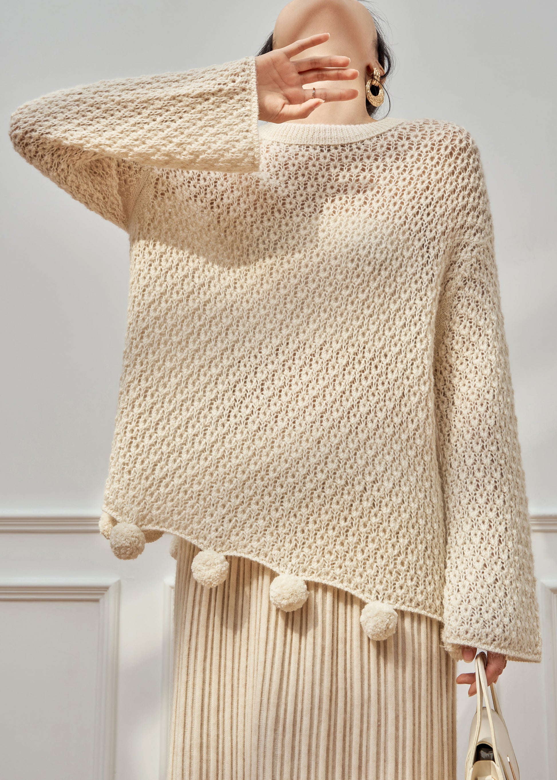 Lockeres beigefarbenes Strickset mit Rundhalsausschnitt, Lochmuster und flauschiger Bommelverzierung, zweiteilig, Herbst