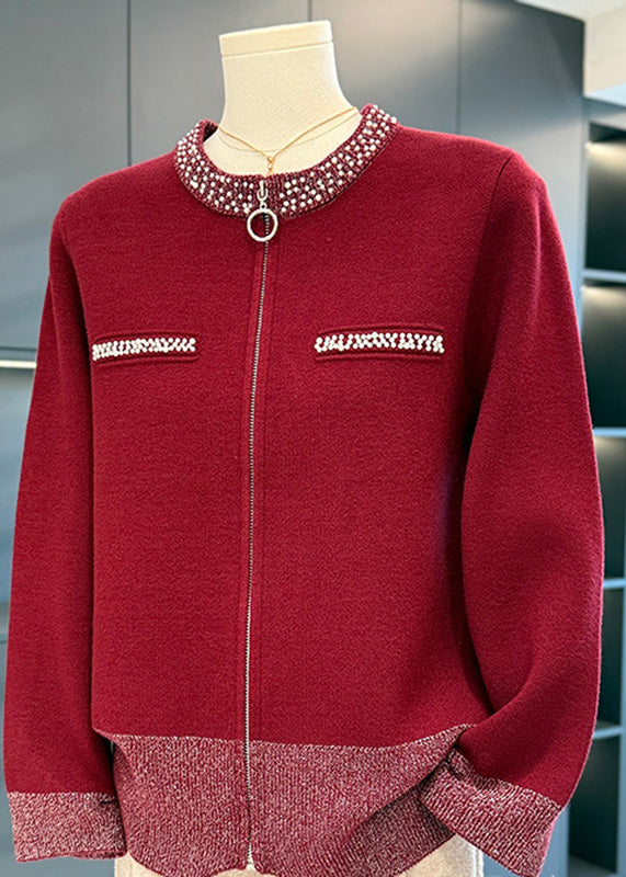 Lockerer, kamelfarbener Baumwollstrickmantel mit Reißverschluss und Ziernägeln für den Frühling
