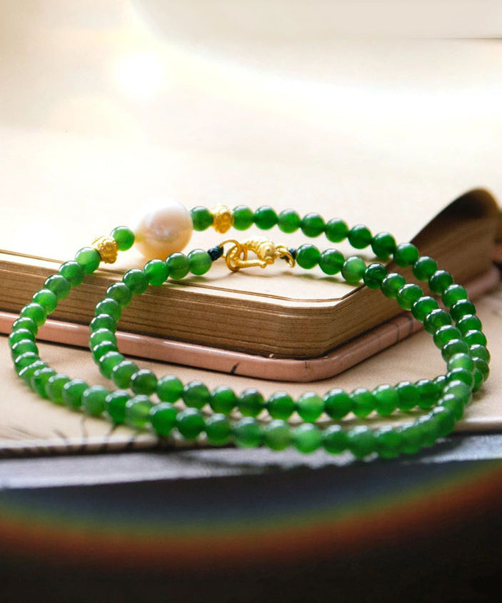 Moderne Halskette mit abgestuften Perlen aus grünem Sterlingsilber mit vergoldeter Jadeperle