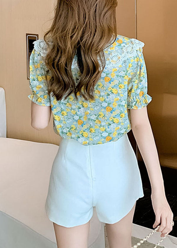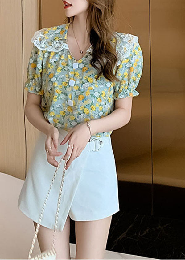 Natürliche Grüne taste Peter Pan Kragen Spitze Patchwork Chiffon Blusen Kurzarm