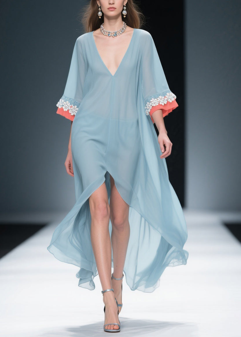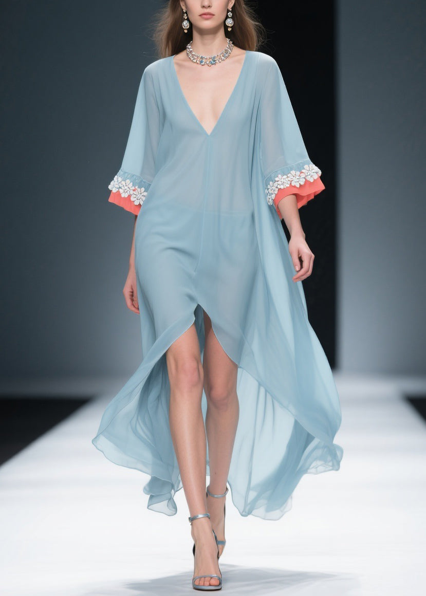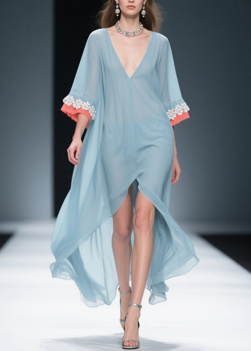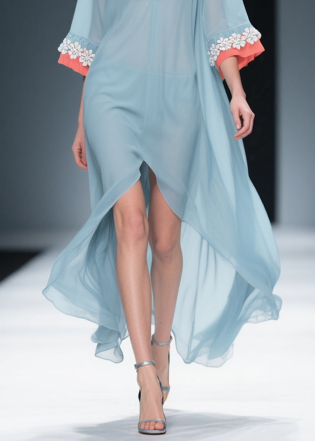 New Blue Low High Design Floral Patchwork Chiffon Dresses Bracelet Sleeve