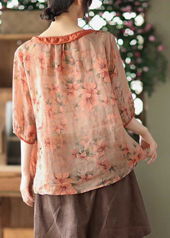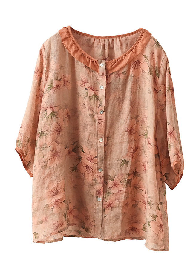 Oranges Ramie-Hemd mit O-Ausschnitt und Knöpfen für den Sommer