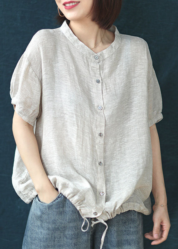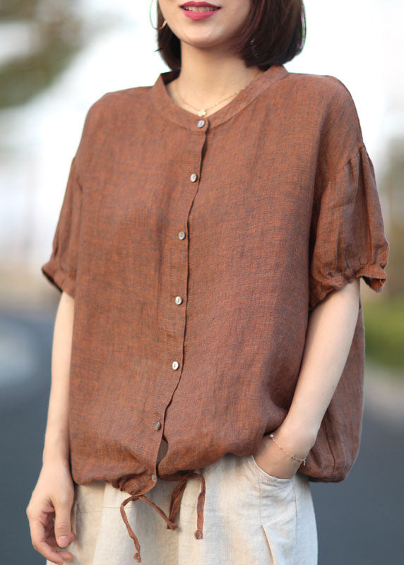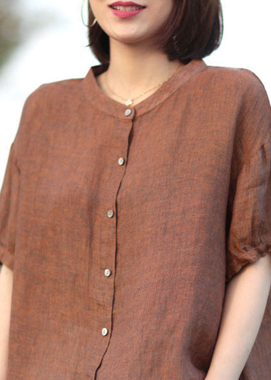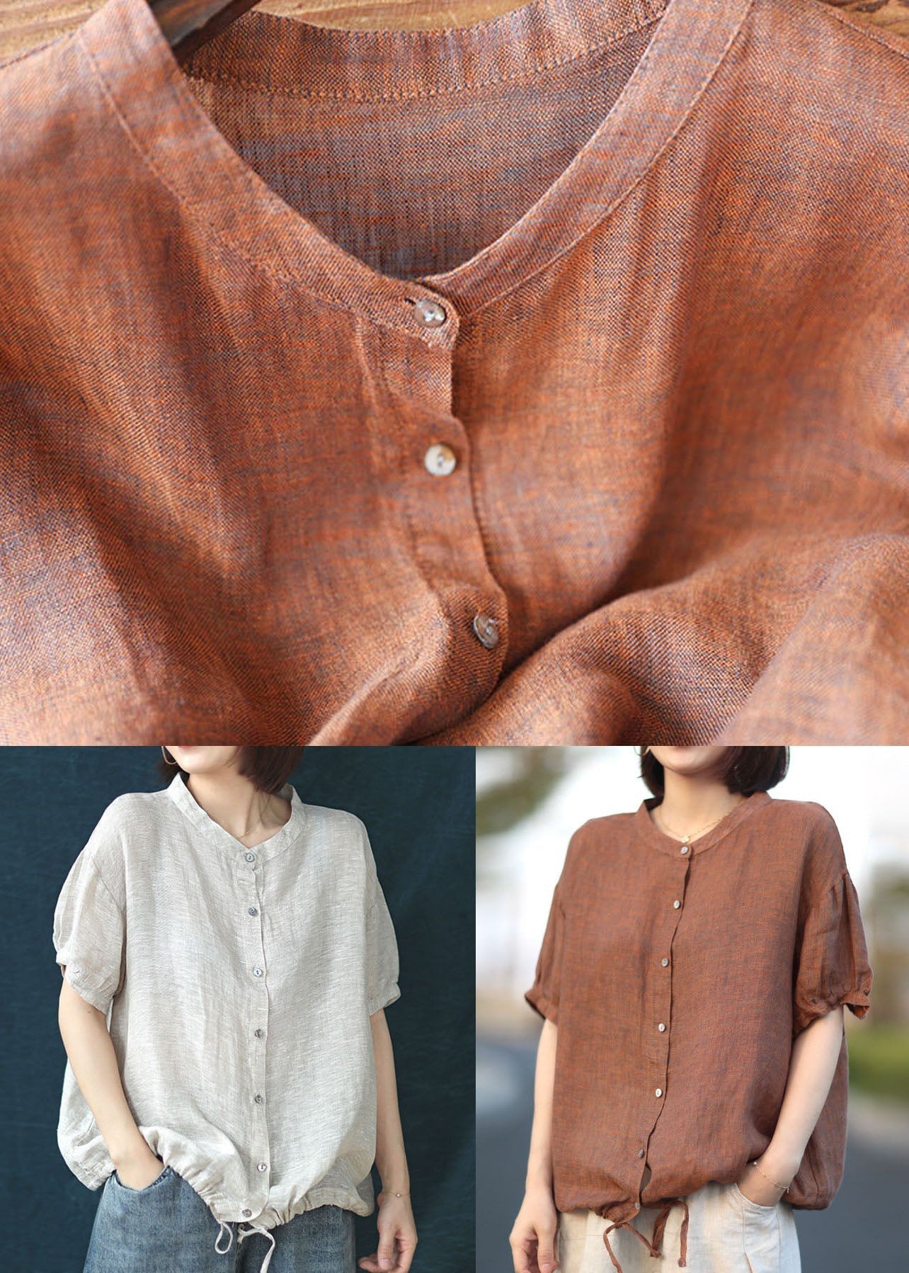 Orange Patchwork Leinenhemd Stehkragen Knopf Kurzarm