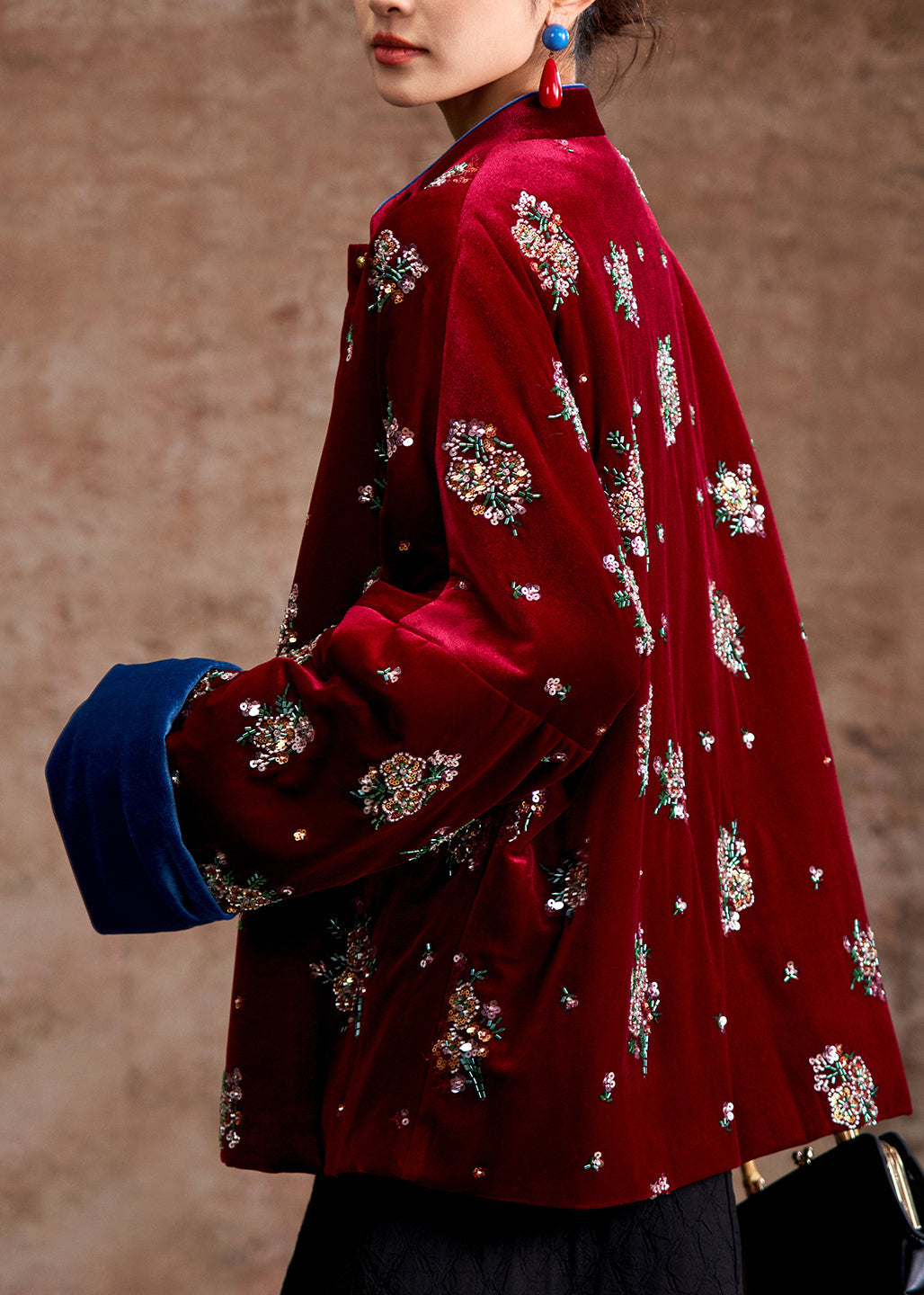 Bio-Parka-Mäntel aus rotem, besticktem Seidensamt mit Stehkragen für den Winter