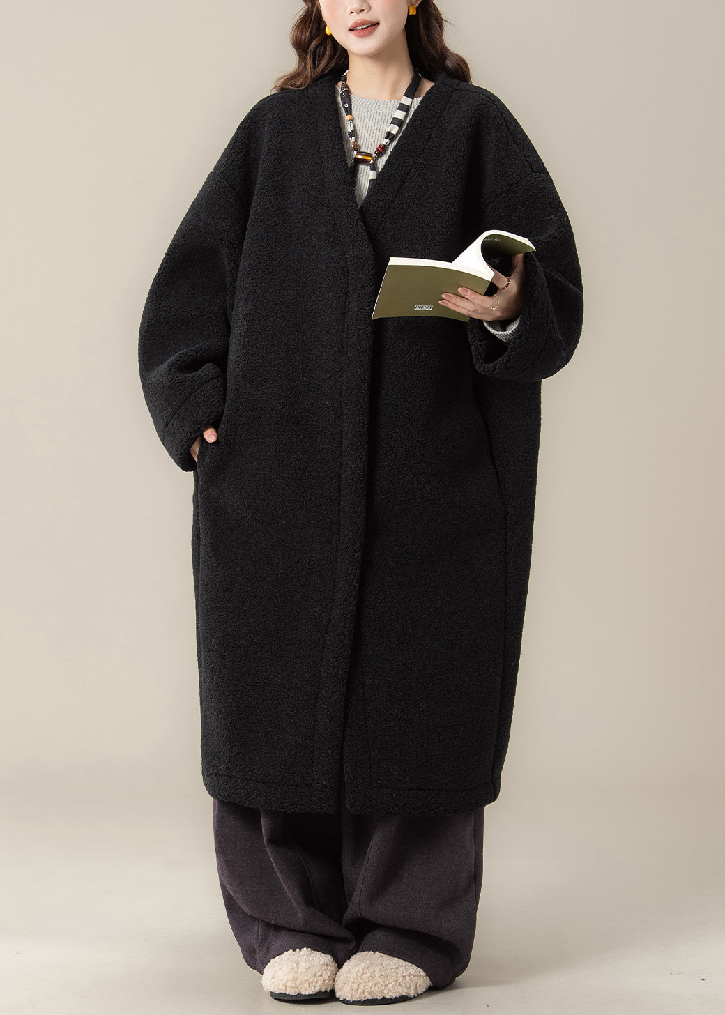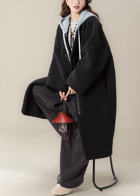 Schwarzer Teddy-Kunstpelzmantel in Übergröße mit Kapuze, Reißverschluss und Patchwork-Design, Winter