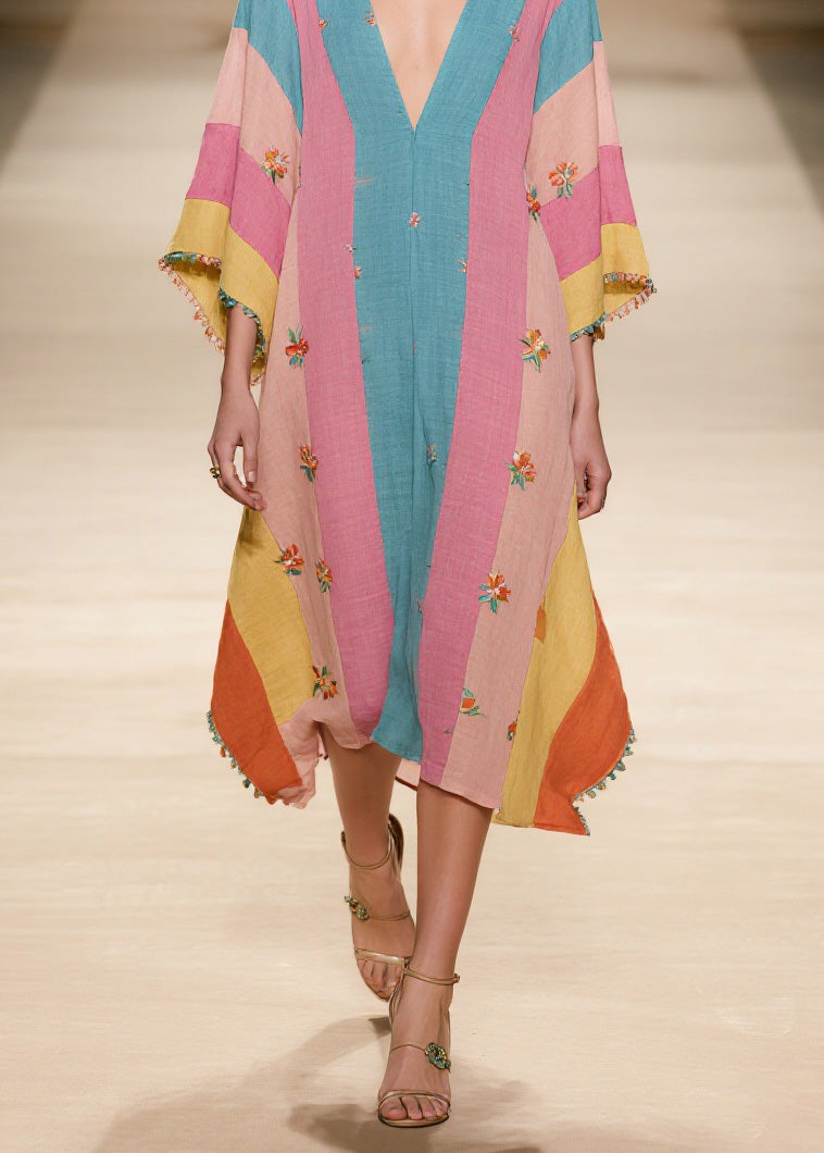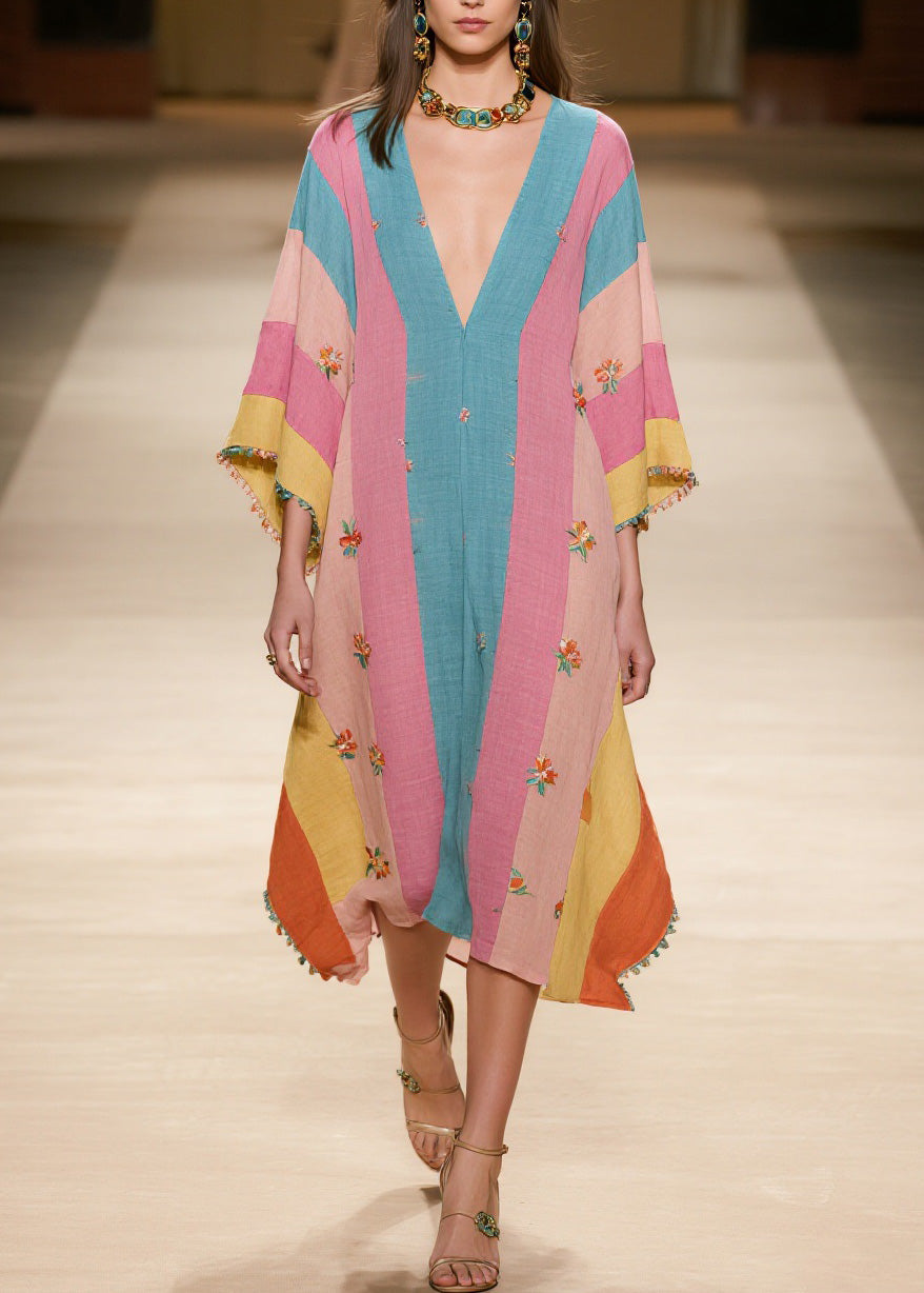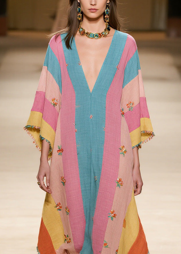 Plus Size Colorblock V Neck Print Cotton Dress Summer