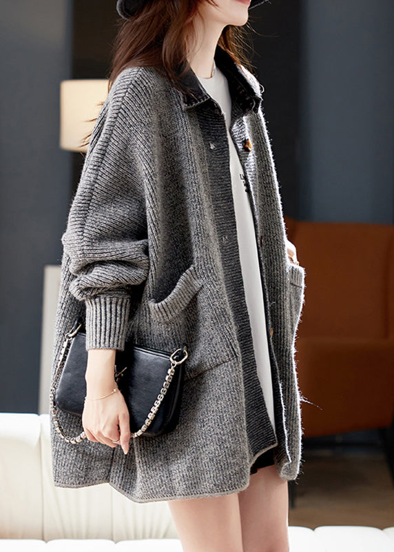 Plus Size Grey Denim Patchwork Pockets Cotton Knit Cardigans Lantern Sleeve