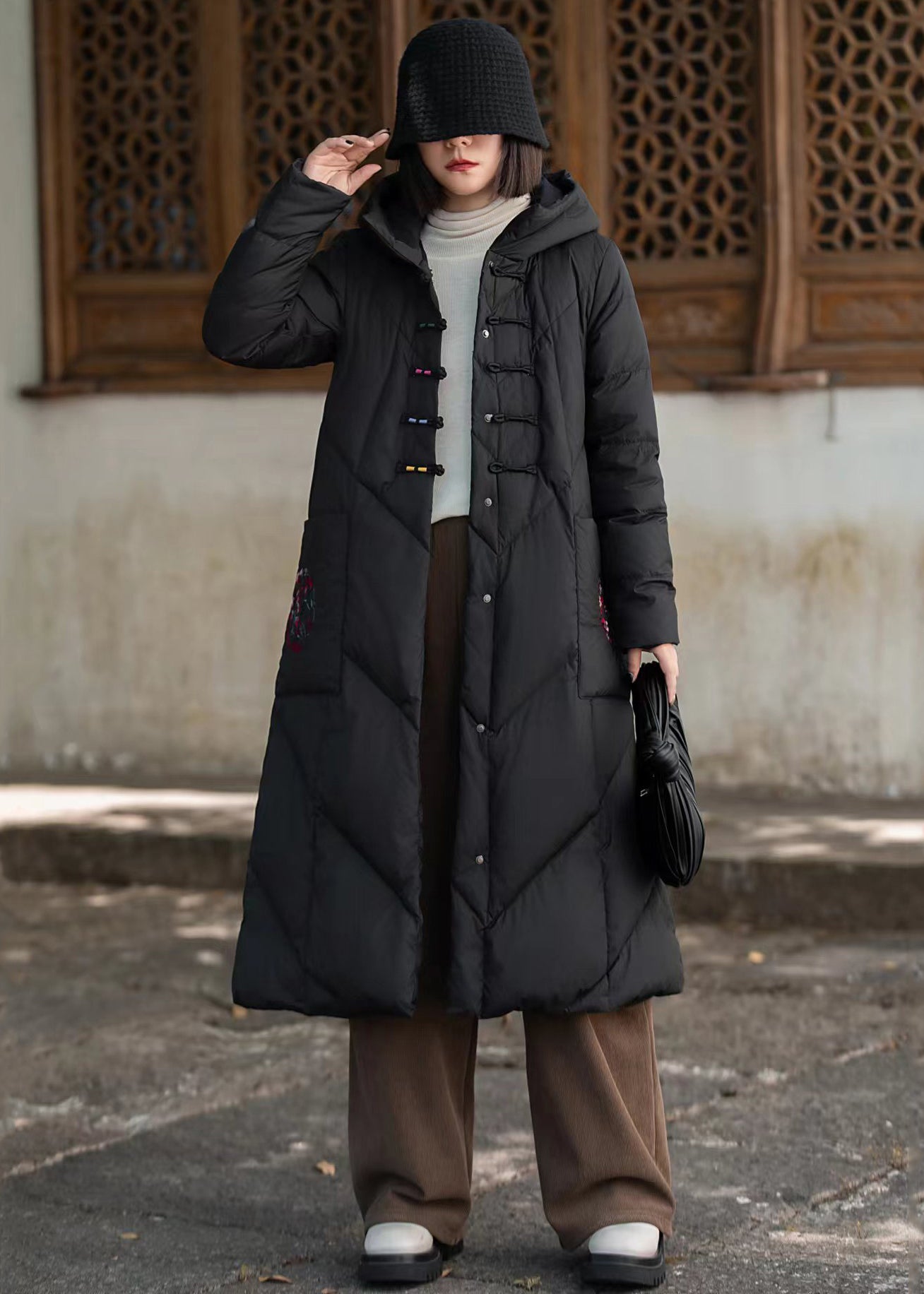 Roter, langer Wintermantel mit chinesischen Knöpfen, Taschen und Entendaunenfüllung, Kapuze