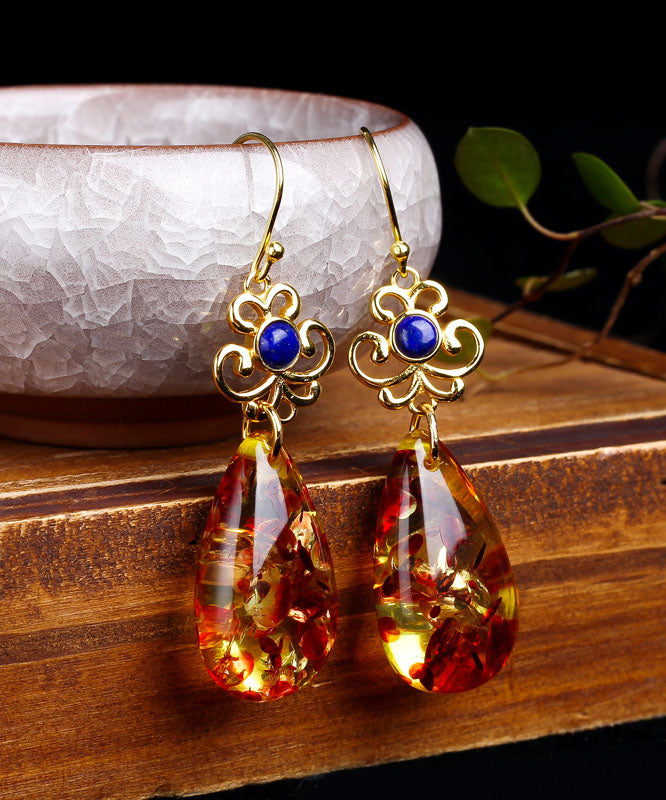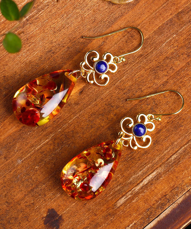 Reguläre Tropfenohrringe aus Sterlingsilber mit vergoldetem Bernstein und eingelegtem Edelstein