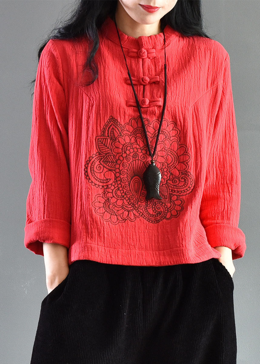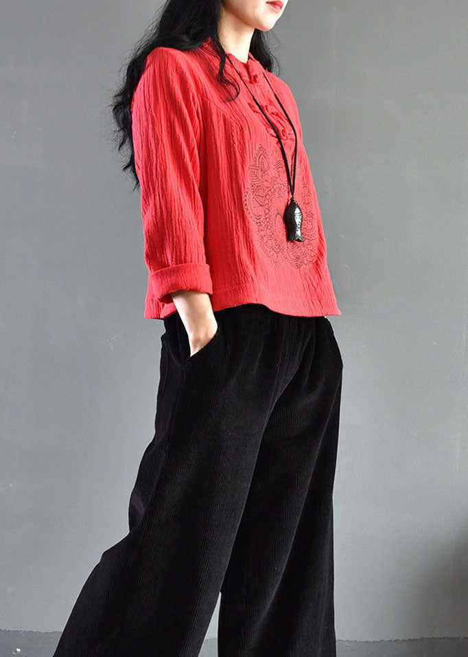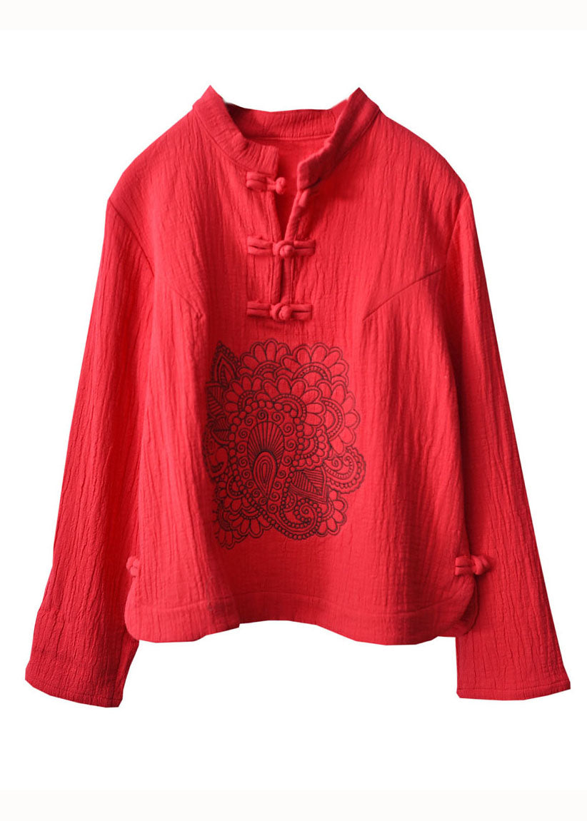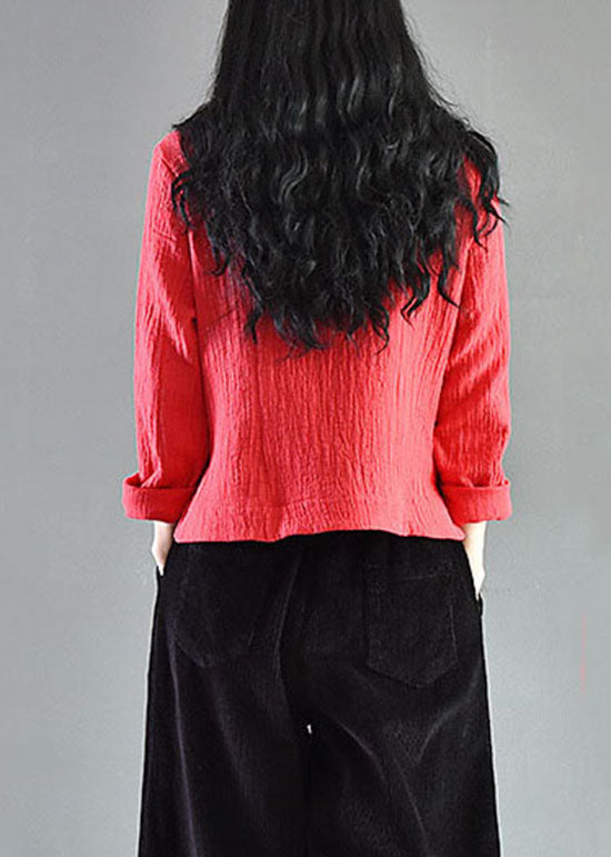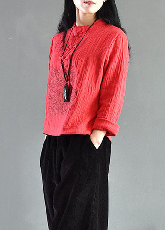 Retro Rot Bestickt Chinesischen Knopf Patchwork Leinenhemden Frühling